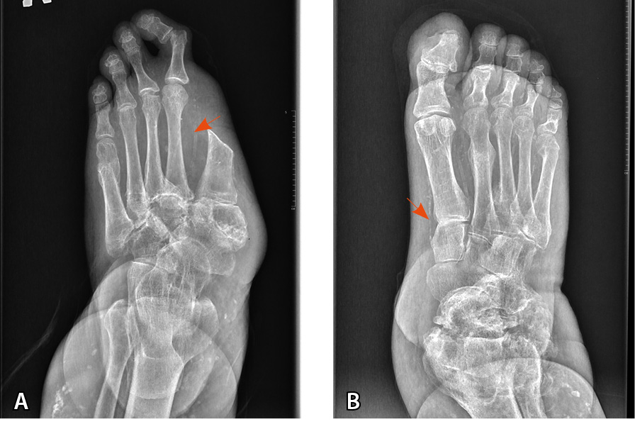 Б – артропатическая перестройка структуры костей предплюсны и правого голеностопного сустава, консолидированные переломы II, III, V пальцев. Остеомиелит ногтевой фаланги I пальца