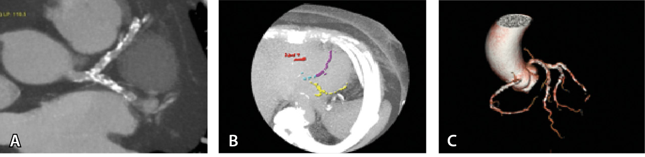 Рис. 6. Мультиспиральная компьютерная томограмма пациента Т., кальциноз коронарных артерий: А – мультипланарная реконструкция, массивные кальцинированные бляшки в передней межжелудочковой и огибающей артериях; Б, В – 3D-реконструкция, кальцинированные бляшки в левой и правой коронарных артериях
