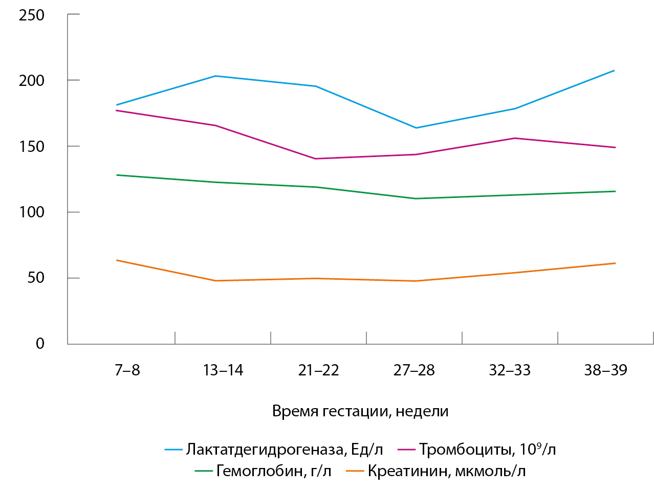 Через 3 месяца после начала прегравидарной подготовки, в ноябре 2019 г. самопроизвольно наступила вторая беременность. Скрининг первого триместра выявил низкий риск хромосомных аномалий у плода. С ранних сроков гестации пациентка получала с целью профилактики ПЭ антиагреганты (до 13 недель – дипиридамол по 75 мг 3 раза в день, с 13-й по 36-ю неделю беременности – ацетилсалициловую кислоту в дозе 150 мг в день) и низкомолекулярный гепарин (эноксапарин натрия подкожно в профилактической дозе) в течение всей беременности и 6 недель после родов. Мы планировали начать профилактическое применение экулизумаба после 20-й недели беременности, однако именно в это время, в марте-апреле 2020 г., в нашей стране начался резкий рост заболеваемости COVID-19 (первая волна пандемии). Поскольку введение препарата требовало дополнительных госпитализаций, существенно возрастал риск инфицирования беременной новой коронавирусной инфекцией, а вакцины против SARS-CoV-2 находились только в стадии разработки. Клинико-лабораторные показатели женщины соответствовали физиологически протекающей беременности, в связи с чем была выбрана выжидательная тактика: частый контроль состояния пациентки с возможностью старта комплемент-блокирующей терапии при первых признаках развития ТМА. К счастью, течение данной беременности не сопровождалось развитием осложнений. Суточная протеинурия не превышала 0,12–0,15 г, уровень АД оставался нормальным. Не наблюдалось значимого снижения количества тромбоцитов или уровня гемоглобина, роста ЛДГ или креатинина сыворотки (рисунок).
