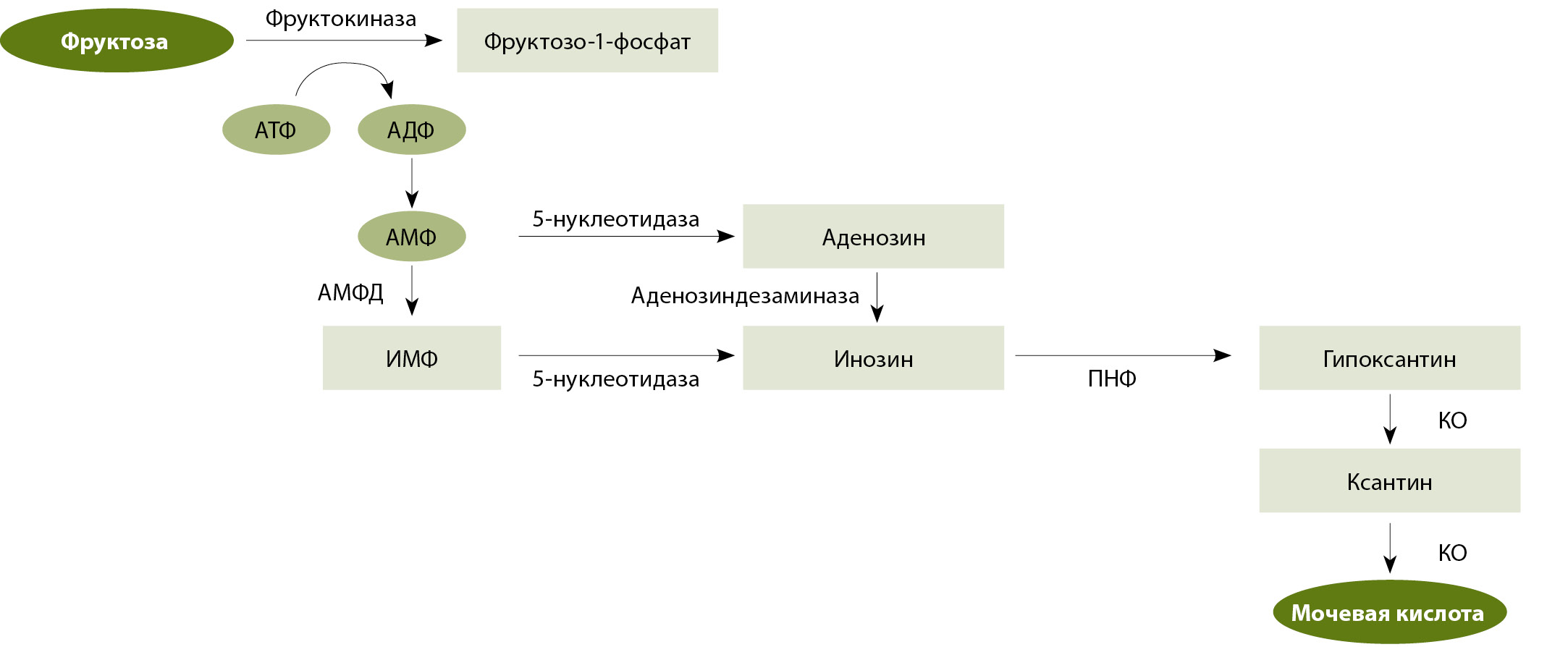 Рис. 1. Механизм продукции мочевой кислоты, индуцированной фруктозой (модифицировано из [11]); АДФ – аденозиндифосфат, АМФ – аденозинмонофосфат, АМФД – аденозинмонофосфат-дезаминаза, АТФ – аденозинтрифосфат, ИМФ – инозинмонофосфат, КО – ксантиноксидаза, ПНФ – пуриновая нуклеозидфосфорилаза