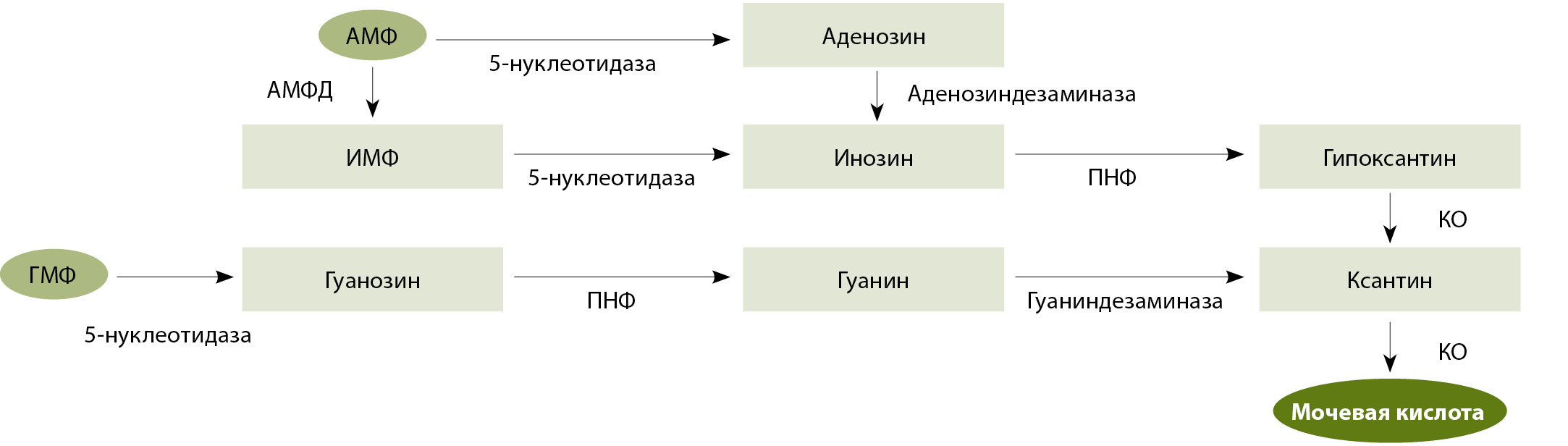 Рис. 2. Механизм продукции мочевой кислоты в процессе метаболизма пуринов (модифицировано из [11]); АМФ – аденозинмонофосфат, АМФД – аденозинмонофосфат-дезаминаза, ГМФ – гуанозинмонофосфат, ИМФ – инозинмонофосфат, КО – ксантиноксидаза, ПНФ – пуриновая нуклеозидфосфорилаза