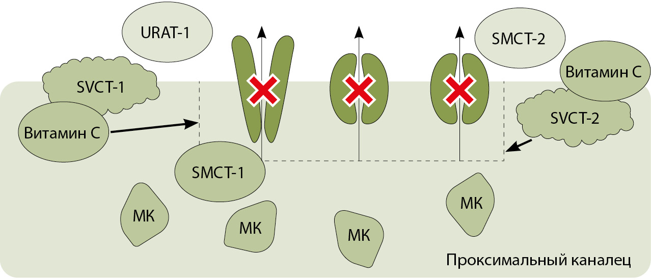 Рис. 3. Роль витамина С в транспорте мочевой кислоты в проксимальных почечных канальцах (модифицировано из [19]); SMCT-1/SMCT-2 (sodium-coupled monocarboxylate transporters) – натрий-связанный монокарбоксилатный транспортер 1-го и 2-го типа, SVCT-1/SVCT-2 (sodium-ascorbate co-transporters) – котранспортер аскорбата натрия 1-го и 2-го типа, URAT-1 (urate transporter-1) – уратный анионообменник, МК – мочевая кислота