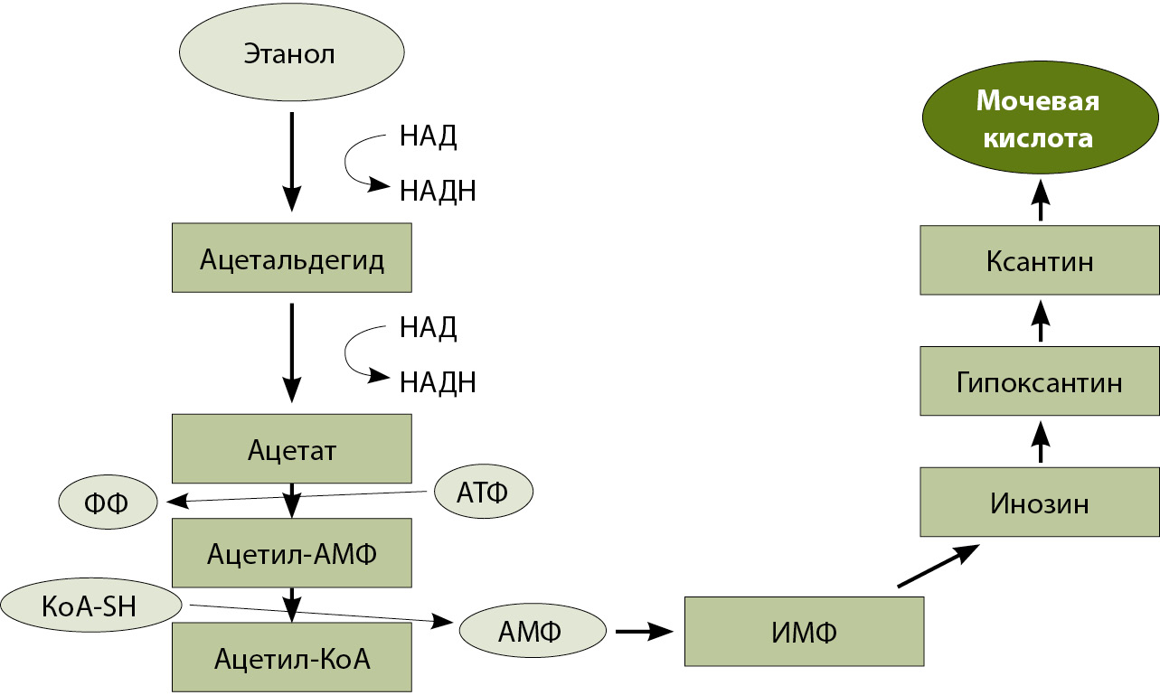 Прием этанола может увеличить уровень уратов в сыворотке крови вследствие как уменьшения экскреции уратов, так и увеличения их выработки. Снижение почечной экскреции уратов происходит в результате преобразования алкоголя в МК, что уменьшает выведение МК почками за счет конкурентного ингибирования секреции МК проксимальными канальцами. Кроме того, введение этанола увеличивает выработку МК, так как возрастает разложение аденозинтрифосфата до аденозинмонофосфата, предшественника МК [31] (рис. 5).