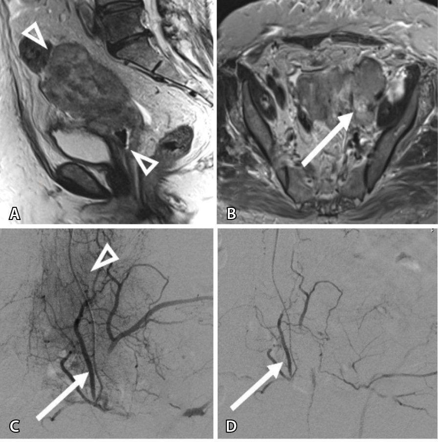 Рис. 3. Женщина 64 лет, рак шейки матки, рецидив через 8 месяцев после системной химиотерапии, профузное маточное кровотечение: А – магнитно-резонансная томография в сагиттальной проекции: опухоль распространяется от дна тела матки до средней трети влагалища (треугольные стрелки); Б – магнитно-резонансная томография в аксиальной проекции демонстрирует опухолевый фрагмент, достигающий боковой стенки малого таза (стрелка); В – этап трансартериальной химиоэмболизации: на ангиограмме определяется сеть опухолевых афферентов (треугольная стрелка), отходящих от подвздошно-поясничной артерии (стрелка); Г – результат эмболизации: опухолевые афференты не контрастируются, проходимость подвздошно-поясничной артерии сохранена (стрелка)