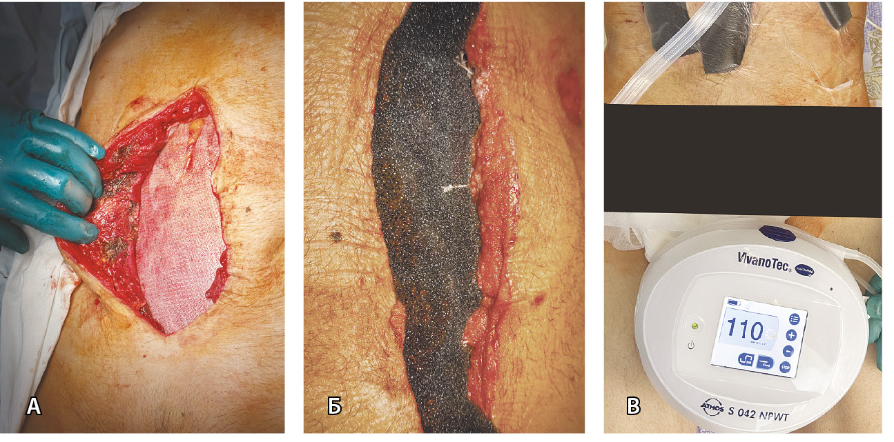 Рис. 4. Пациент С., 70 лет, выполнена радикальная цистэктомия с формированием илеокондуита по Bricker, послеоперационное течение осложнено на 1-е сутки перфорацией подзвдошной кишки, разлитым серозно-фибринозным перитонитом. А – 3-я этапная лапаростомия, некрэктомия мышц срединной лапаротомной раны, смена неадгезивной пленки, покрывающей петли тонкой кишки; Б – края апоневроза сопоставлены наводящими лигатурами, дно раны заполнено полипропиленовой губкой; В – внешний вид раны; подключен аппарат, нагнетающий отрицательное давление (постоянный контур Р = 110 мм рт. ст.)