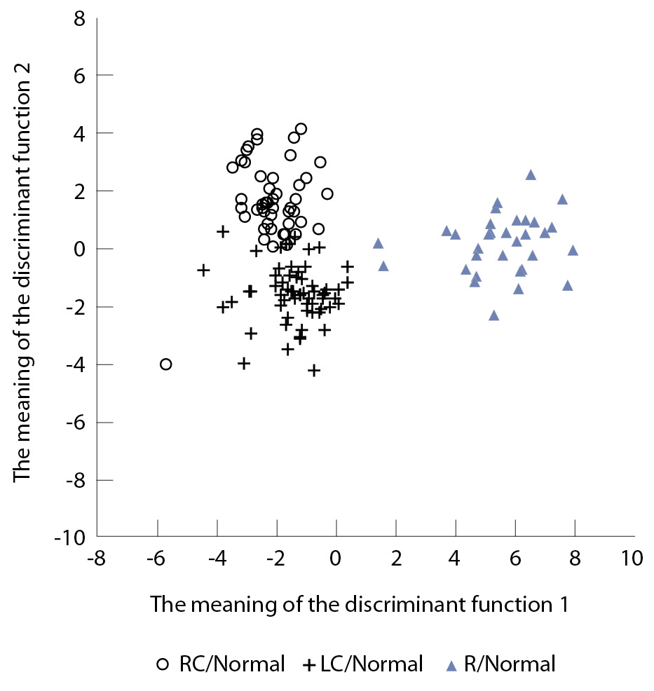 В ходе дискриминантного анализа применяли следующие критерии: 1) лямбда Уилкса (λ) – для оценки значимости различий средних значений дискриминантной функции в исследуемых группах и подгруппах; 2) частная лямбда – для характеризации вклада единичной переменной в дисперсию («разделительная сила» модели); 3) F-критерий (критерий Фишера) – для оценки значимости различия дисперсий выборок и проверки, являются ли все переменные-предикторы совместно значимыми; 4) толерантность – мера оценки избыточности переменных в модели.