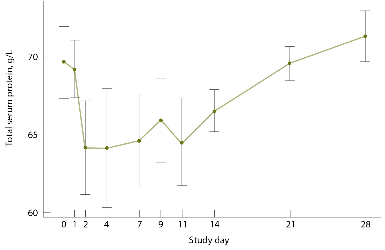 | Визит 3 День 28 (± 1) | 3 | 3,55 | 3,85 | 0,22–7,48 | 1,46 | 2,56 | 5,44 | 3,05 | 4,50 | 1,44 | |||