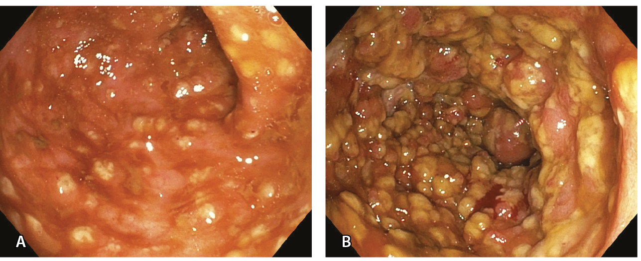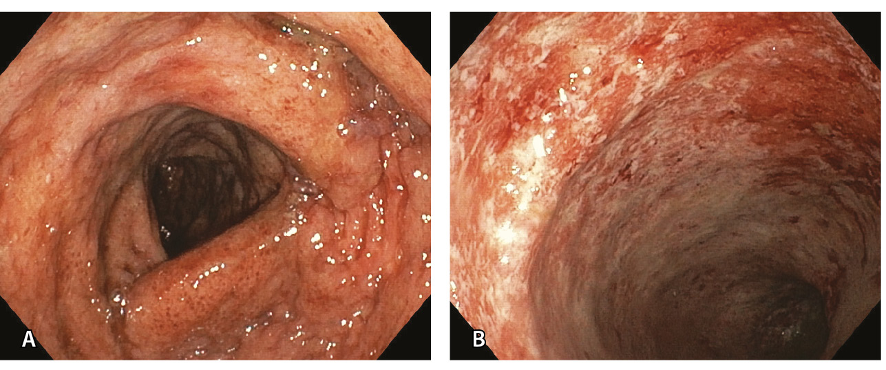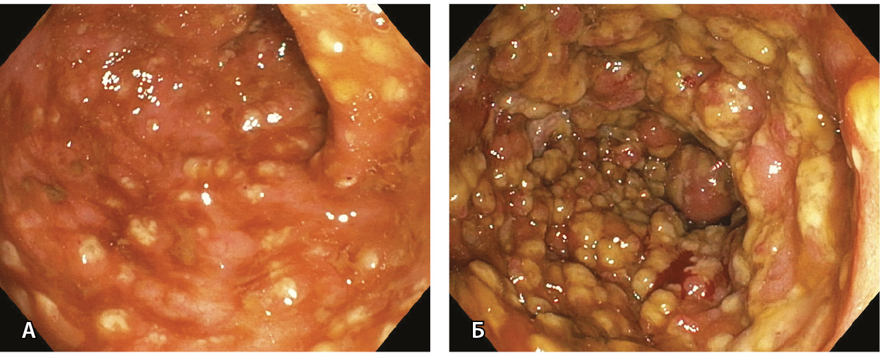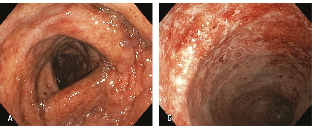 Рис. 3. Эндоскопическая картина язвенного колита умеренной активности (А; больной 38 лет) и высокой активности (Б; больной 47 лет), впервые возникшего после перенесенной инфекции SARS-CoV-2