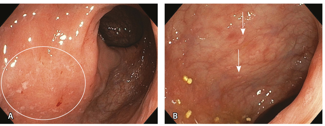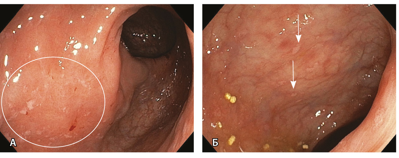 Рис. 4. Эрозии слизистой оболочки толстой кишки после инфекции SARS-CoV-2 у больной 38 лет: А – эрозии слизистой оболочки сигмовидной кишки с отсутствующим местами сосудистым рисунком; Б – мелкие эрозии на фоне сохраненного сосудистого рисунка в нисходящей ободочной кишке