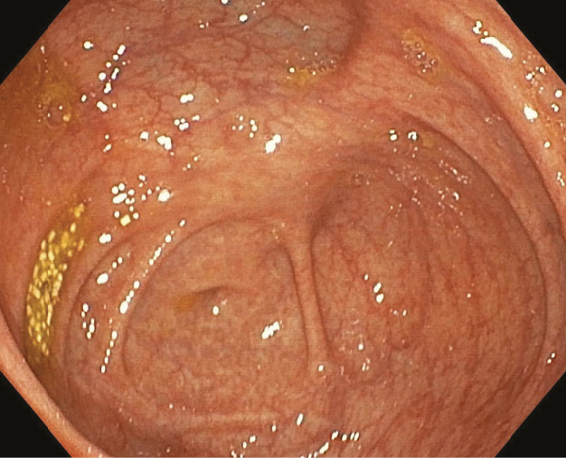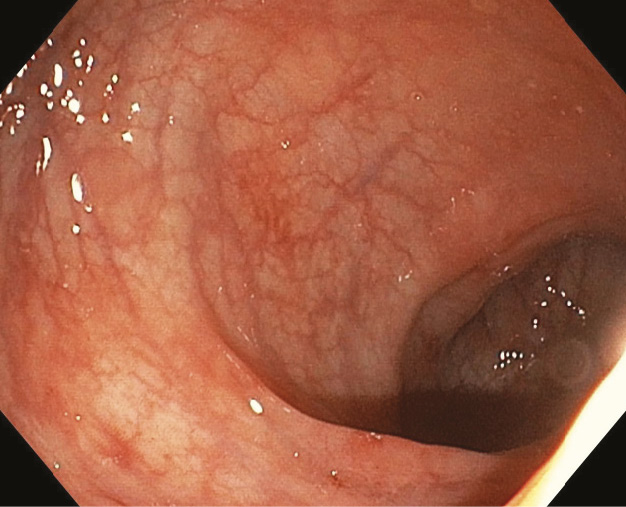 Рис. 5. Неизмененная слизистая оболочка толстой кишки с усилением сосудистого рисунка у больного с интенсивной диареей, лихорадкой и повышением С-реактивного белка после перенесенной инфекции SARS-CoV-2