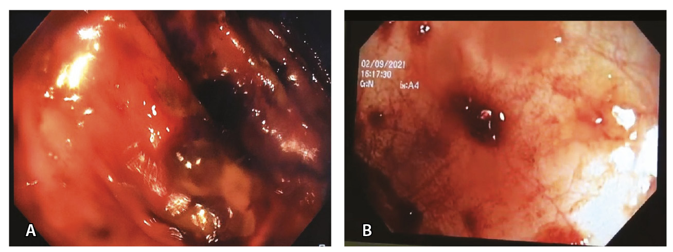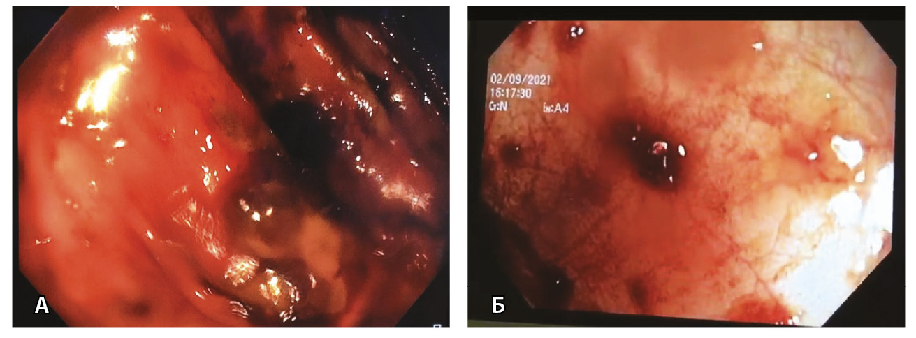 Рис. 7. Кишечное кровотечение после перенесенной инфекции SARS-CoV-2: А – больная 62 лет; Б – больная 37 лет