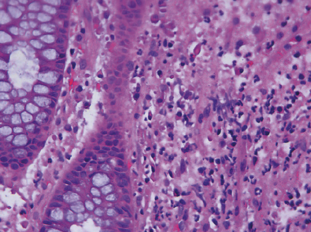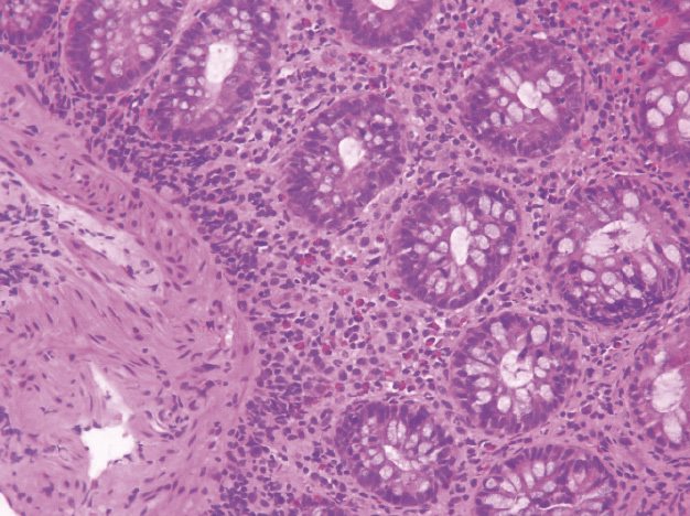 Рис. 8. Умеренная лимфоплазмоцитарная инфильтрация собственной пластинки слизистой оболочки толстой кишки с немногочисленными эозинофилами, умеренно выраженной регенераторной гиперплазией. Структура крипт сохранена, незначительно уменьшено количество бокаловидных клеток. Окраска гематоксилином и эозином; × 200