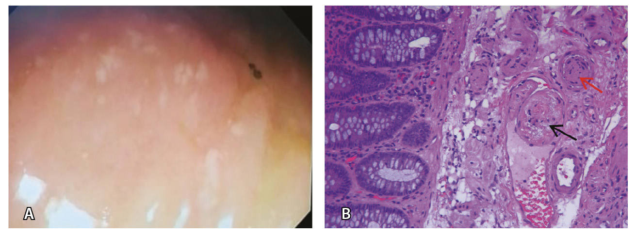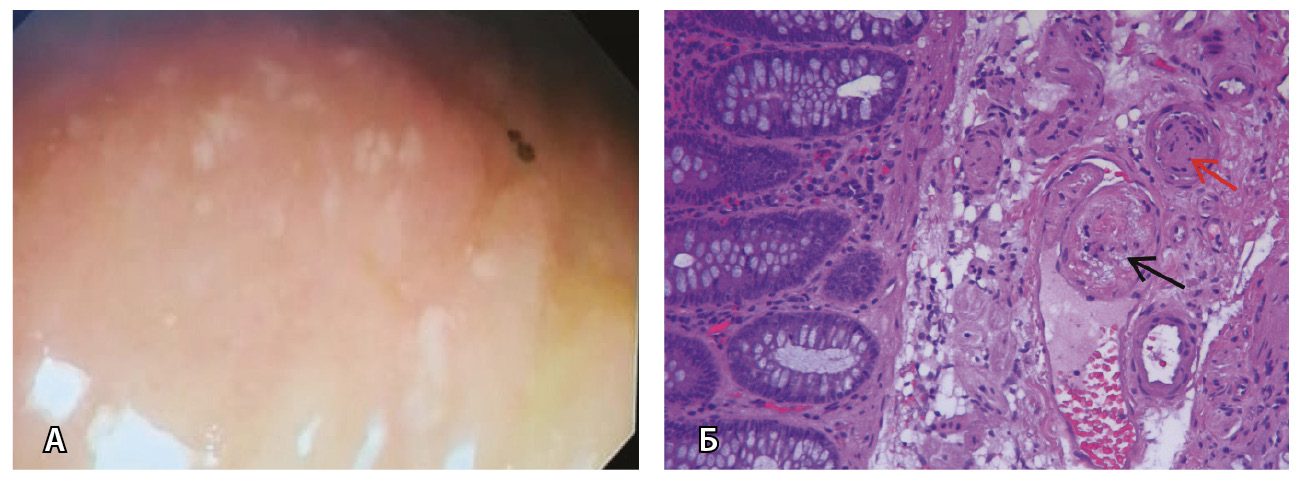 Рис. 10. Поражение толстой кишки у больной 48 лет после перенесенной инфекции SARS-CoV-2: А – при илеоколоноскопии видны единичные эрозии слизистой оболочки толстой кишки; Б – по данным биопсии из подслизистого слоя толстой кишки обнаружены фибриновые тромбы в просветах вены (черная стрелка) и артерии мелкого калибра (красная стрелка) подслизистого слоя в отсутствие воспаления в собственной пластинке слизистой оболочки. Окраска гематоксилином и эозином; × 200