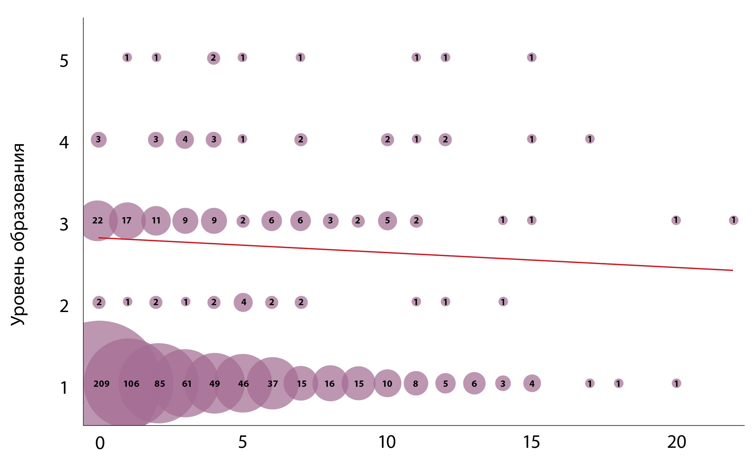Для оценки связи между уровнем образования и баллом выбран ранговый коэффициент корреляции Спирмена, при этом уровню образования присвоены следующие ранги: 1 – среднее образование, 2 – среднее специальное, 3 – высшее, 4 – имеется степень кандидата наук, 5 – имеется степень доктора наук. Количество исследуемых пар – 827 (1 анкета была исключена из анализа в связи с пропуском данных при заполнении графы «Образование»). В результате анализа (рис. 2) установлена слабая связь между исследуемыми признаками (r = 0,157203, р < 0,05).