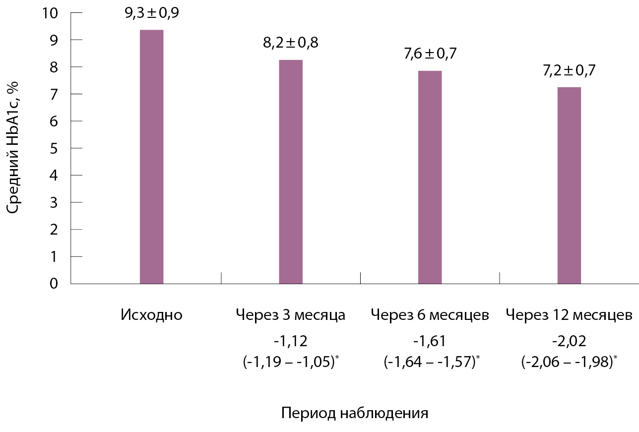 HbA1c исходно, % (среднее ± СО) | 9,3 ± 0,9 |