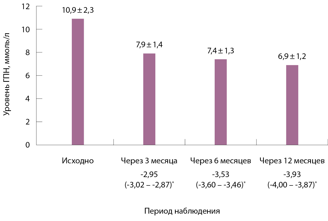 Динамика уровня HbA1c на протяжении исследования. Отмечено снижение уровня HbA1c от исходных значений к визитам через 3, 6 и 12 месяцев: через 6 и 12 месяцев среднее снижение HbA1c составило -1,6 и -2,0% соответственно (рис. 2). Что касается динамики уровня ГПН в сравнении с исходными значениями, снижение среднего уровня ГПН через 6 и 12 месяцев было -3,5 и -3,9 ммоль/л (рис. 3).