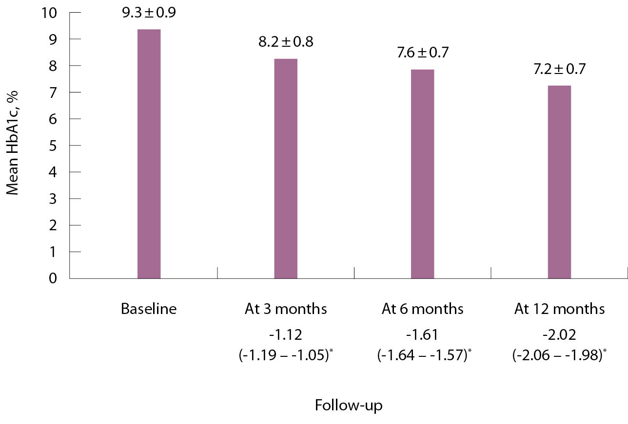 Рис. 2. Динамика уровня HbA1c; * динамика среднего HbA1c от исходного значения (анализ модели со смешанными эффектами для повторных измерений), среднее по методу наименьших квадратов (95% доверительный интервал)