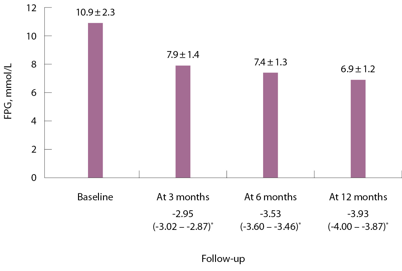 Рис. 3. Динамика уровня глюкозы плазмы натощак (ГПН); * динамика среднего уровня ГПН от исходных значений (анализ модели со смешанными эффектами для повторных измерений), среднее по методу наименьших квадратов (95% доверительный интервал)