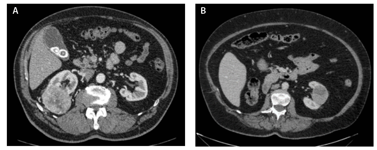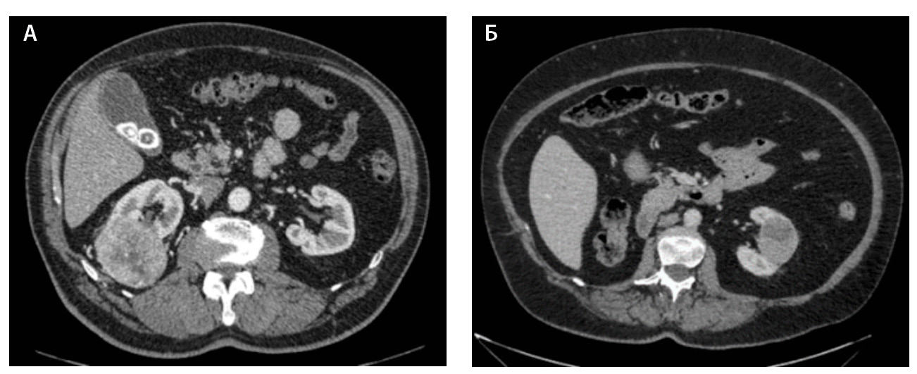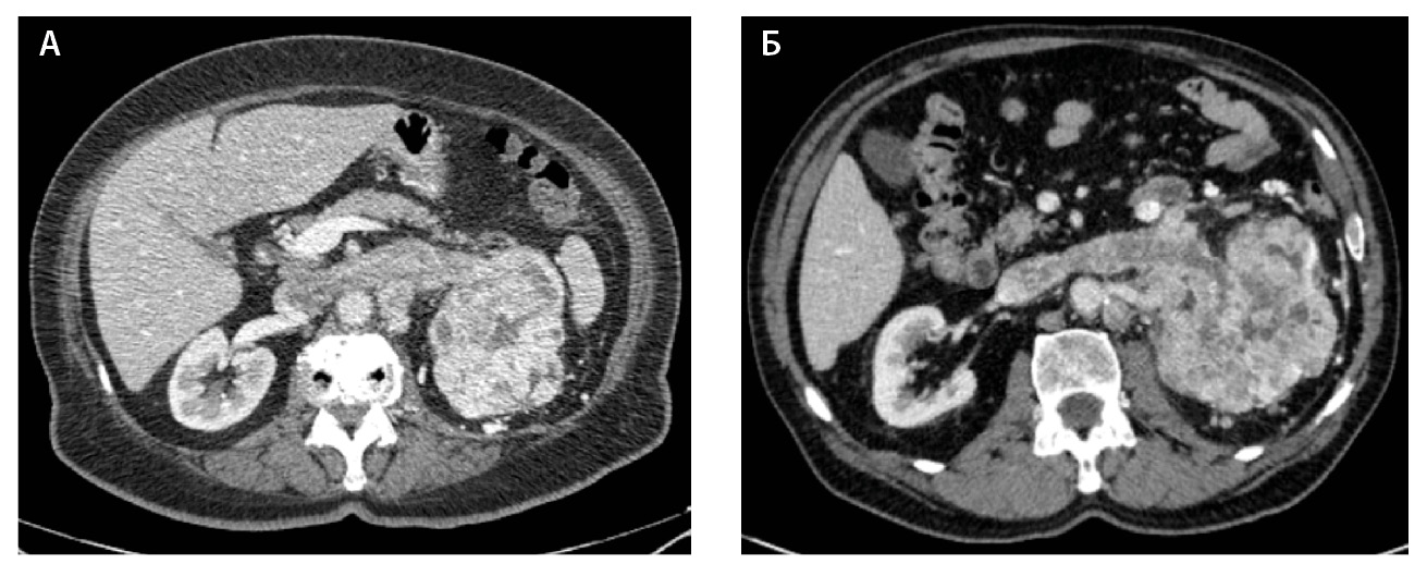 Рис. 2. Светлоклеточный почечно-клеточный рак. А – Grade 1 (данные компьютерной томографии пациента С.), кортико-медуллярная фаза исследования: трансмуральная опухоль правой почки размером 6,6 см, с четкими и ровными контурами, прилежит к синусу почки, опухоль имеет солидно-кистозное строение, солидный компонент опухоли накапливает контрастное вещество (КВ) менее интенсивно, чем кортикальный слой почки, градиент накопления КВ солидным компонентом опухоли 50–60 HU. Б – Grade 4 (данные компьютерной томографии пациентки Щ.), кортико-медуллярная фаза исследования: трансмуральная опухоль левой почки размером 5,2 см, с четкими и ровными контурами, прилежит к синусу почки, опухоль имеет солидно-кистозное строение, солидный компонент опухоли накапливает КВ менее интенсивно, чем кортикальный слой почки, градиент накопления КВ солидным компонентом опухоли 45–60 HU