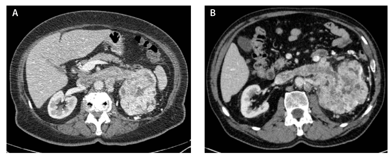 3. Fig. 1. Clear cell renal cell carcinoma: А, Grade 4 (computed tomography, patient B.); B, Grade 2 (computed tomography, patient G.). The cortico-medullary phase of both CT images: a hypervascularized tumor of solid and cystic structure, replacing the left renal parenchyma, the tumor thrombus in the left renal vein lumen extending to the inferior caval vein, and an abnormal regional lymphatic node with metastases