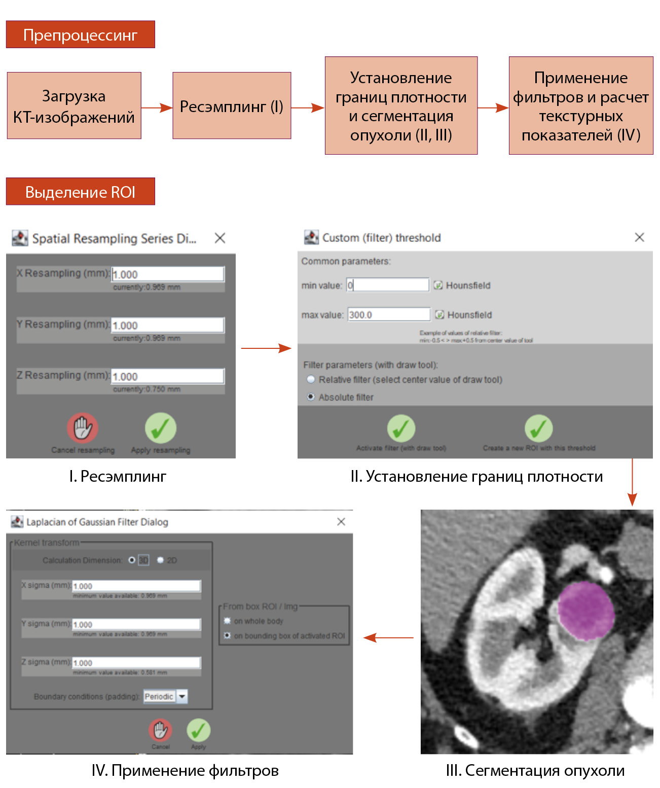 С целью минимизации эффекта цифрового шума и улучшения воспроизводимости текстурных характеристик после формирования ROI применялся фильтр Gaussian Laplacian с условиями Reflect, Periodic, Edge для каждой выделенной зоны интереса. Рабочий процесс показан на рис. 3.