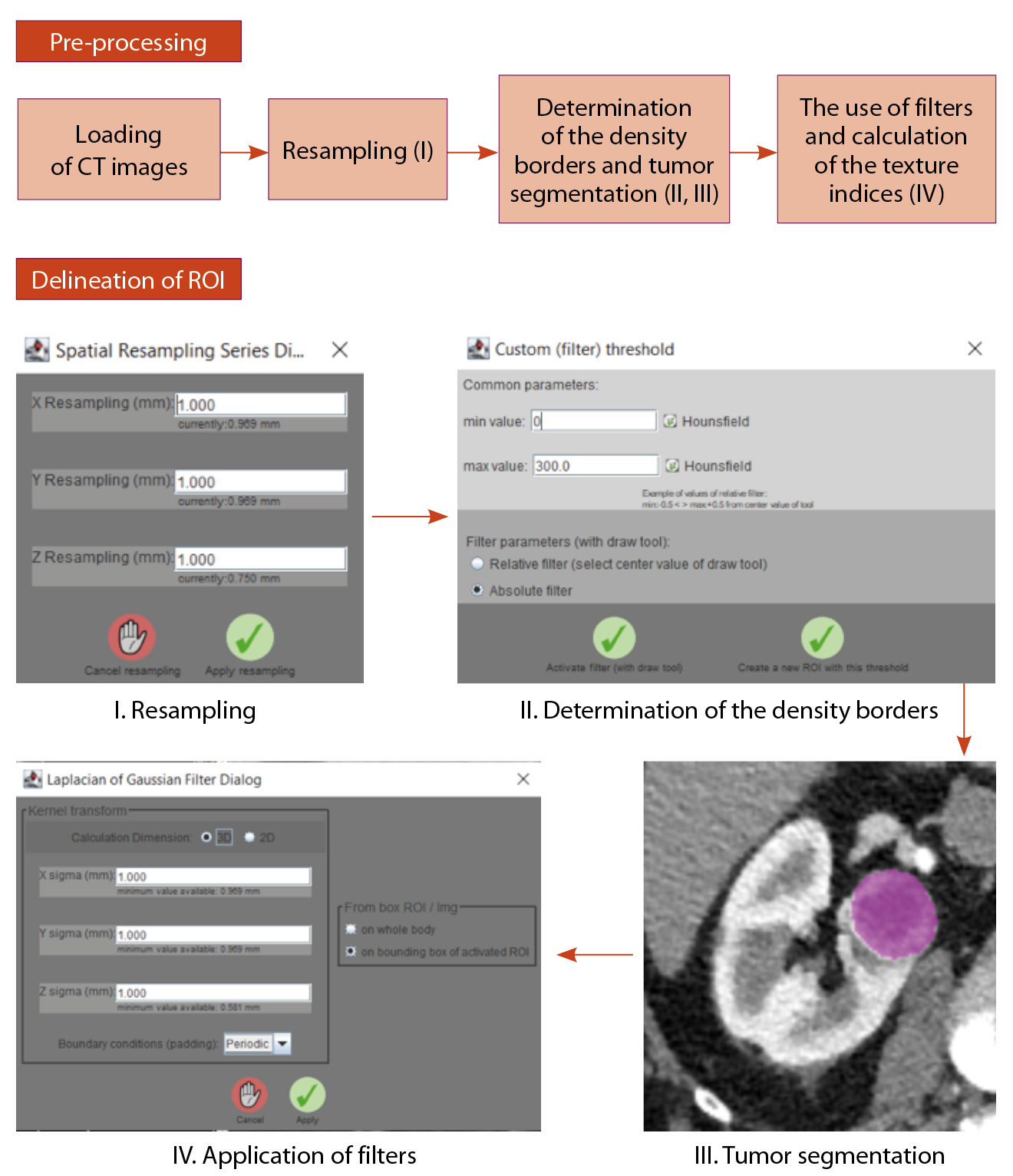 Для вычисления текстурных показателей использовалось открытое бесплатное программное обеспечение LIFEx (версия v7.1.0, www.lifexsoft.org) [12]. Для выполнения сегментации опухоли почки с последующим проведением текстурного анализа были выбраны кортикомедуллярная и нефрографическая фазы, так как в эти фазы степень гетерогенности опухоли визуально наибольшая. Для устранения различий толщины среза КТ-исследований первым этапом выполнялась повторная выборка (ресэмплинг, англ. resampling). Cмысл этапа заключается в приведении данных всех КТ-исследований к единой толщине среза за счет интерполяции данных, в нашем исследовании выбрана толщина среза в 1 мм. Этот этап потенциально позволяет стандартизировать данные КТ-исследований, полученных на разных томографах.