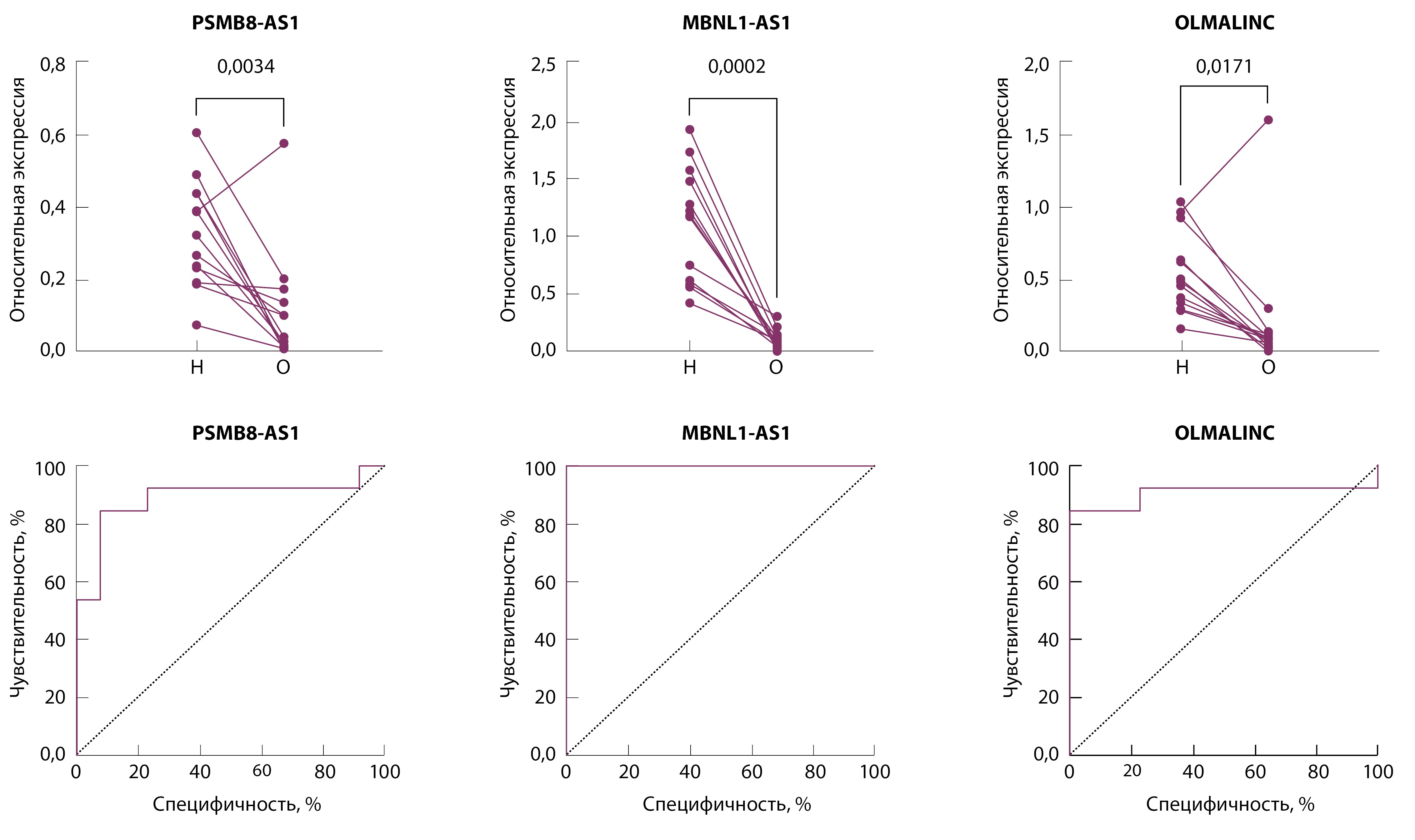 Рис. 1. Сравнительный анализ экспрессии (верхний ряд) и ROC-анализ (нижний ряд) PSMB8-AS1, MBNL1-AS1 и OLMALINC в условно нормальной и опухолевой ткани легкого и ее диагностическая значимость; Н – условно нормальная ткань легкого, О – ткань опухоли легкого