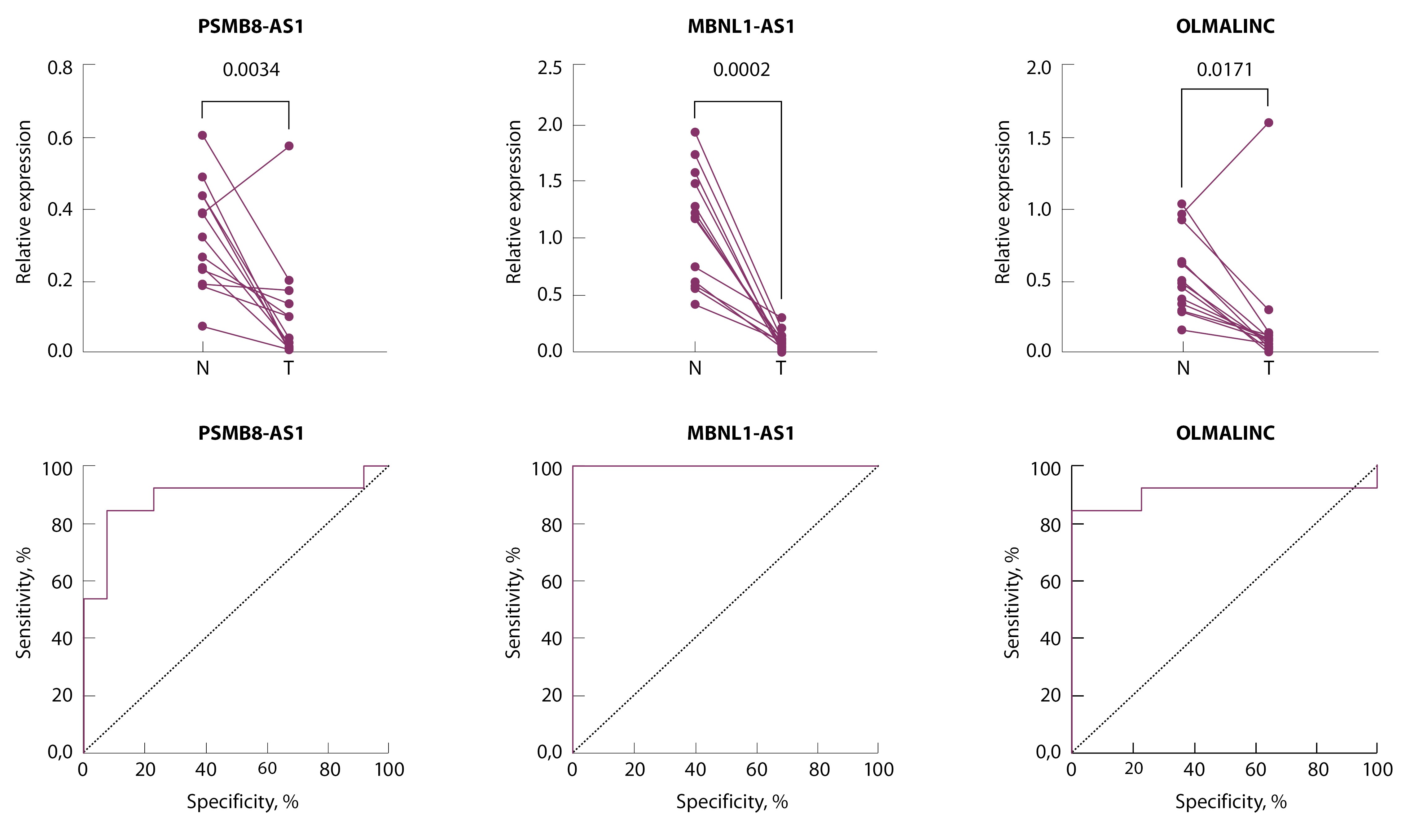 Экспрессия днРНК PSMB8-AS1, MBNL1-AS1 и OLMALINC была значимо снижена в опухолевой ткани легкого по сравнению с условной нормой (p = 0,0034; p = 0,0002; p = 0,0171 соответственно) (рис. 1). Результаты ROC-анализа показали значимую роль оценки экспрессии изучаемых днРНК в диагностике НМРЛ: для PSMB8-AS1 AUC составила 0,887 (p = 0,0008), для MBNL1-AS1 – 1,0 (p < 0,0001), для OLMALINC – 0,905 (p = 0,0004) (см. рис. 1).
