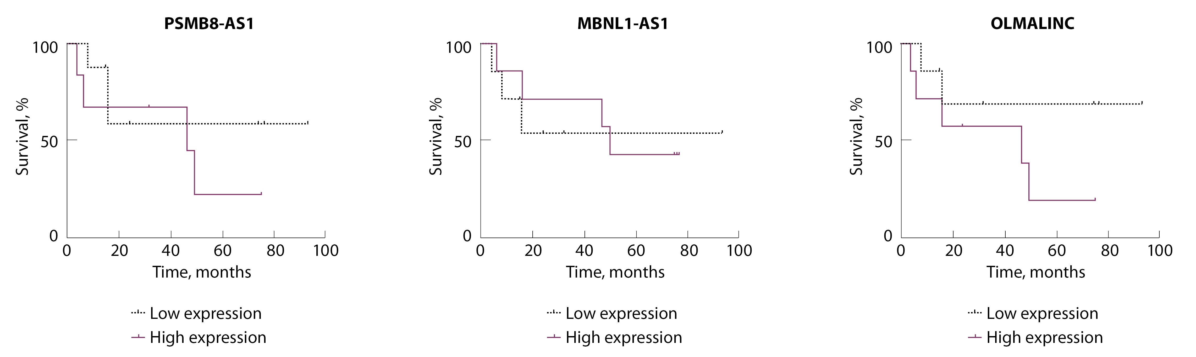 Как видно на рис. 2, экспрессия днРНК PSMB8-AS1, MBNL1-AS1 и OLMALINC не была значимым прогностическим фактором. Тем не менее в случае высокой экспрессии OLMALINC и PSMB8-AS1 медиана выживаемости составила 47 месяцев, тогда как в случае низкой экспрессии не была достигнута за весь период наблюдения.