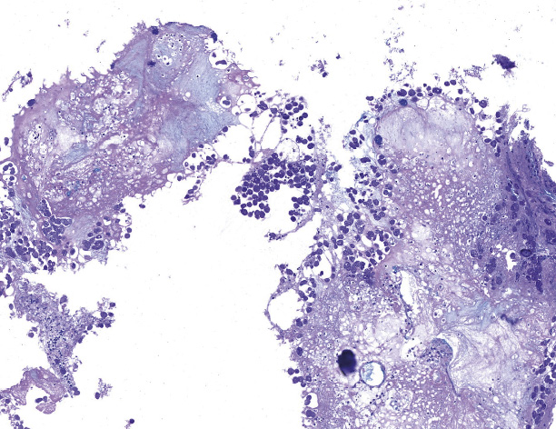 Рис. 2. Гистологическое исследование препарата из язвы купола слепой кишки: скопления трофозоитов E. histolytica. Окраска альциановым синим и ШИК-реакция (PAS); × 400
