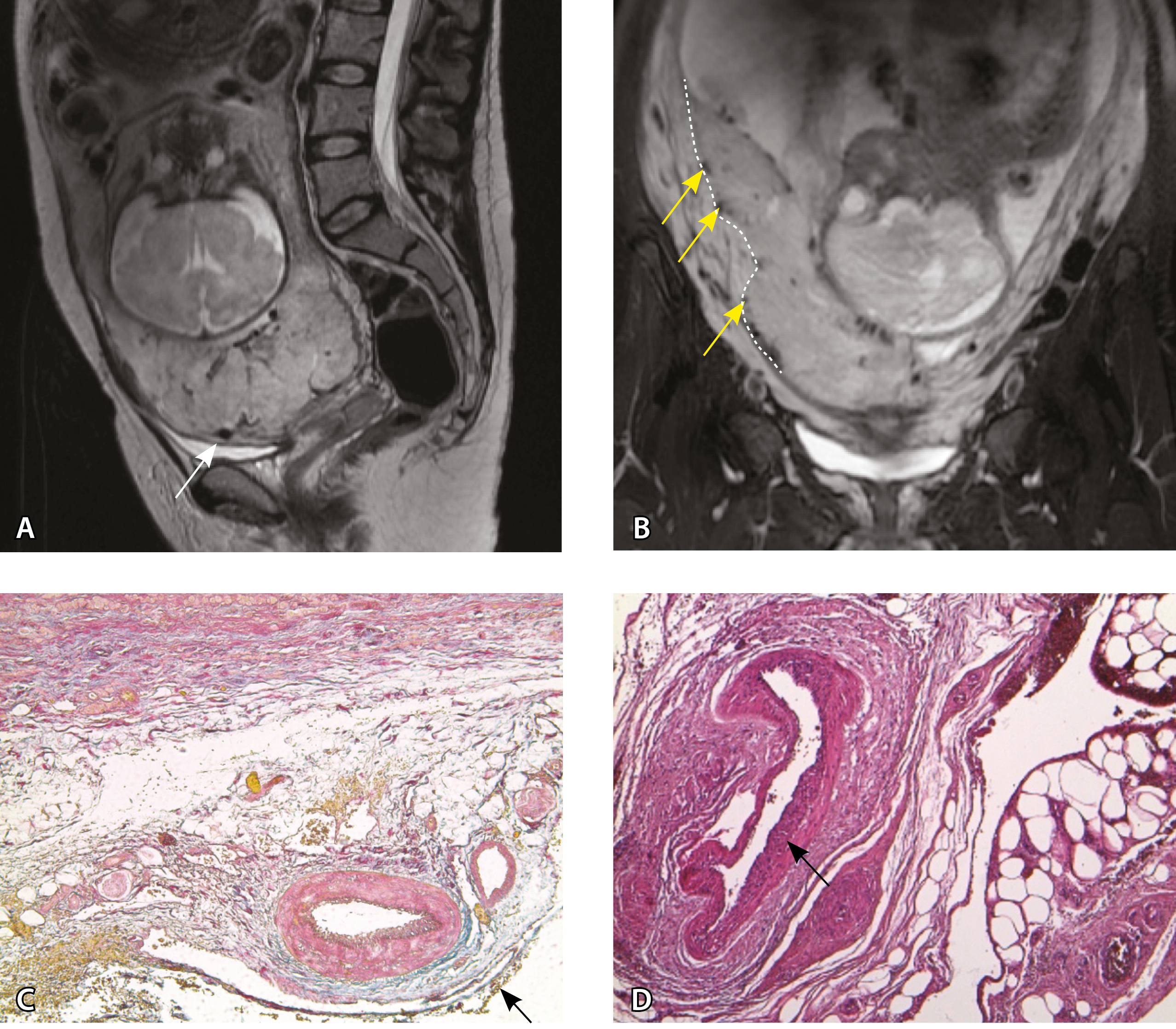 Рис. 2. Беременность 32 недели, центральное предлежание плаценты без признаков приращения. На магнитно-резонансных томограммах в режиме Т2-взвешенного изображения (Т2ВИ) в сагиттальной плоскости (А) и Т2ВИ с подавлением сигнала от жировой ткани во фронтальной плоскости (Б) видны мелкие ретроплацентарные сосуды, расположенные на границе плаценты и рубца на матке от кесарева сечения (белая стрелка) либо плаценты и миометрия (желтые стрелки; плацентарная площадка указана белой пунктирной линией). Фото микропрепарата: В – визуализируются мелкие артерии и вены в составе серозной оболочки, стрелкой указан слой мезотелия (окраска азокармином по Маллори; × 50); Г – маточно-плацентарный сегмент, стрелкой указан сосуд в толще миометрия на границе с плацентой (окрашивание гематоксилином и эозином; × 50)