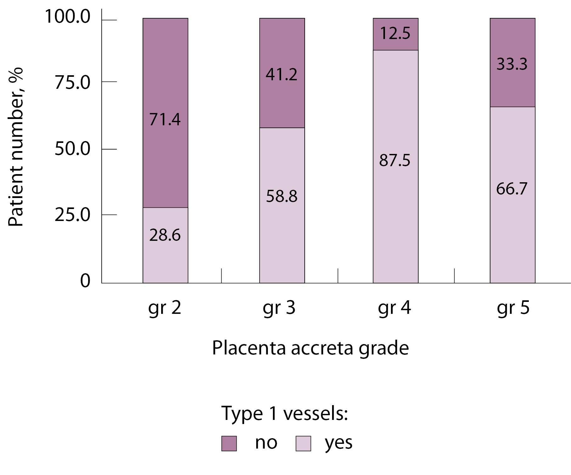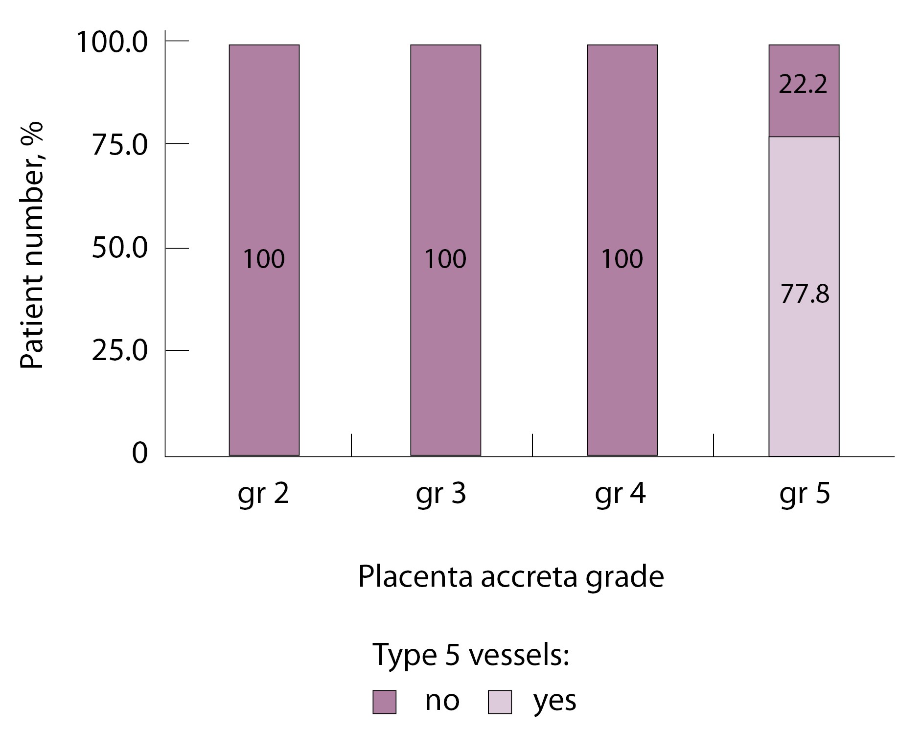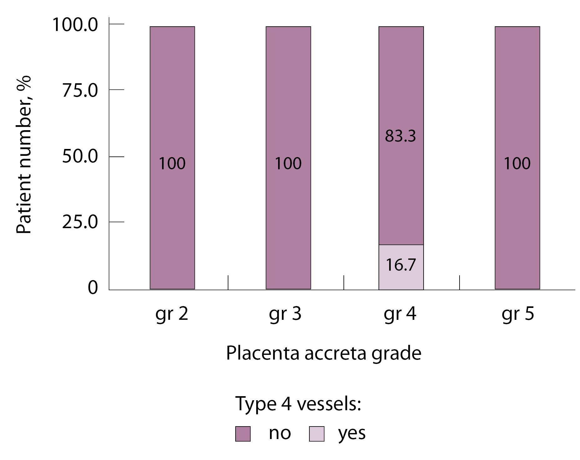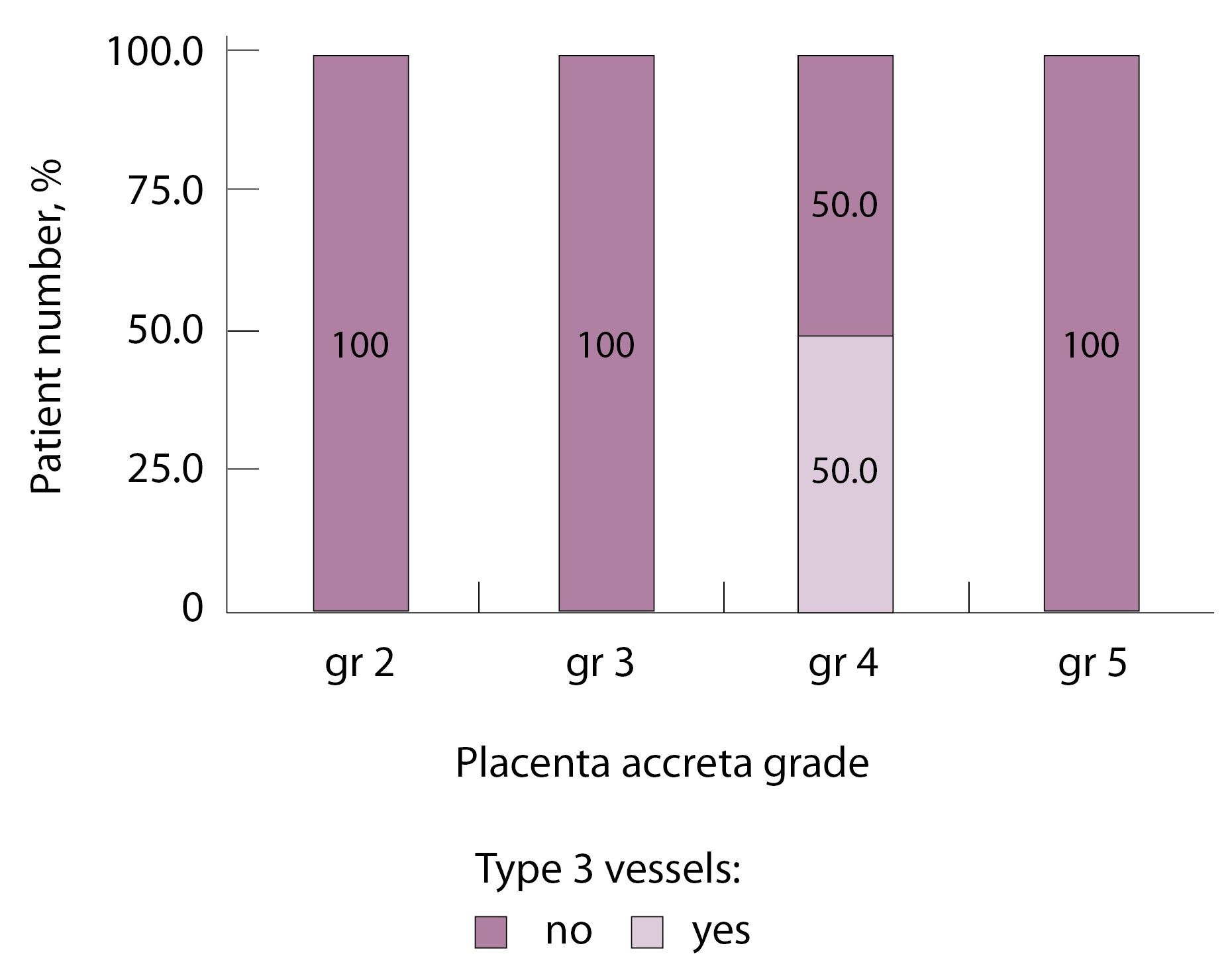 При анализе частоты встречаемости сосудов 3-го типа в зависимости от степени приращения плаценты (рис. 9) отмечается преобладание данного типа сосудов при глубоких вариантах инвазии плаценты – pl. increta (gr 4), pl. percreta (gr 5) – и отсутствие их при плотном прикреплении плаценты (gr 2) и поверхностном приращении (pl. accretа, gr 3) (р < 0,001, хи-квадрат Пирсона).