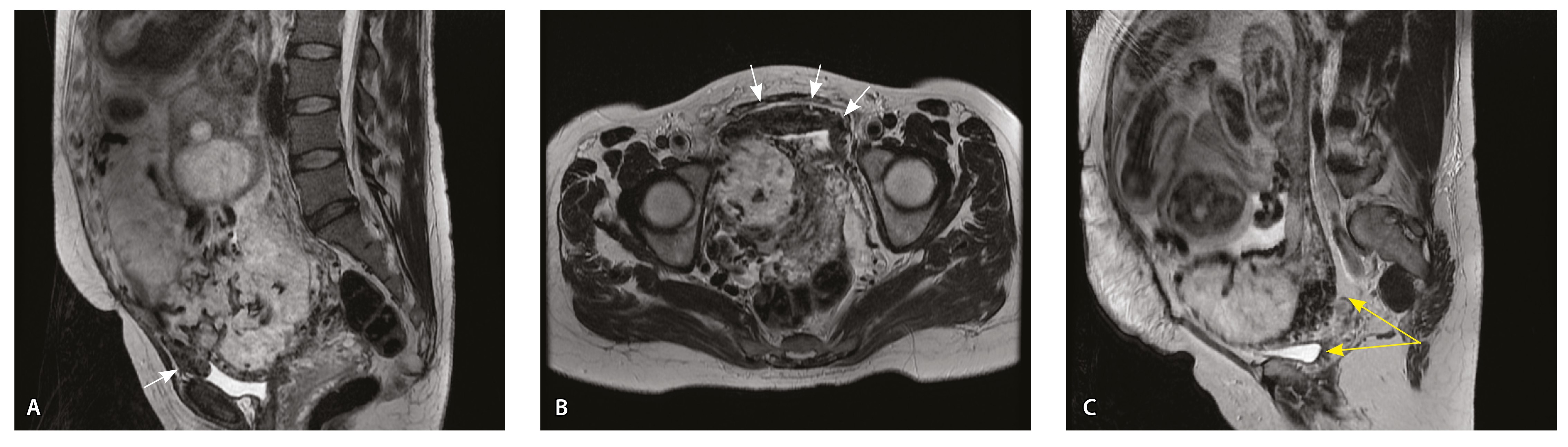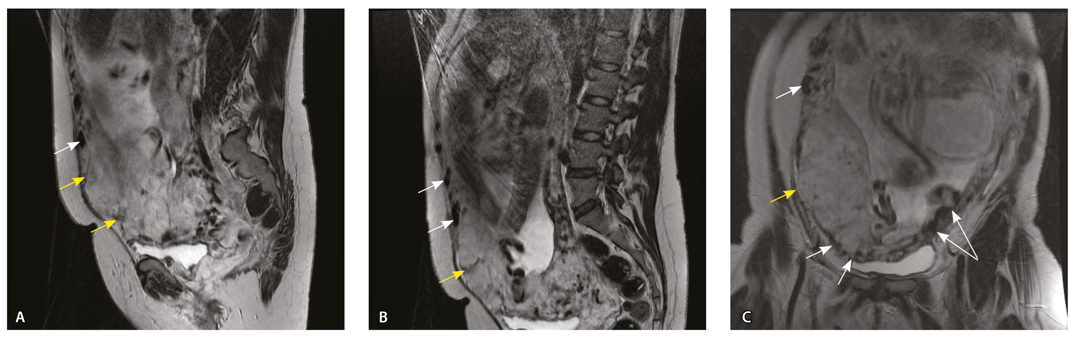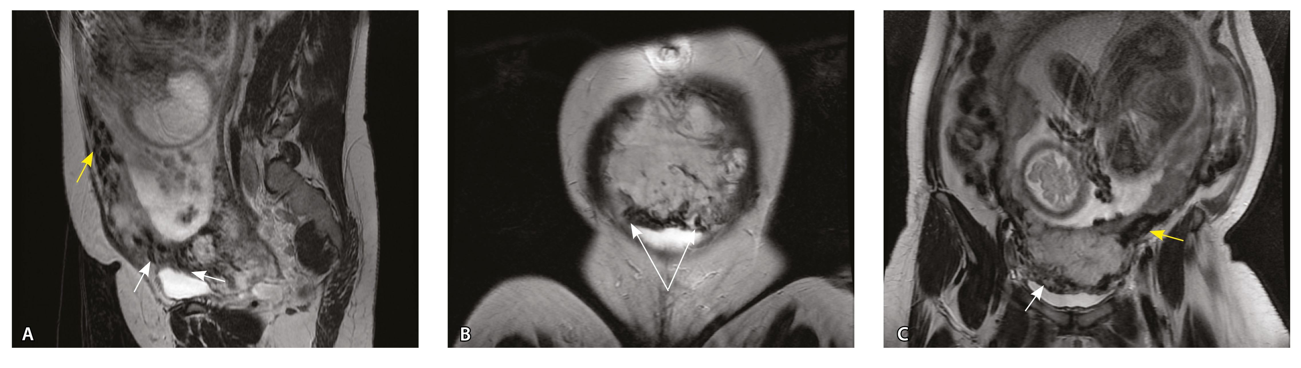 Рис. 10. Беременность 33 недели, pl. percreta, PAS 3a по FIGO. На магнитно-резонансных томограммах в режиме Т2-взвешенного изображения в сагиттальной (A) и фронтальной (Б, В) плоскостях определяется внутриматочная гиперваскуляризация (желтые стрелки) и гиперваскуляризация в области выраженно истонченного нижнего маточного сегмента, с наличием многочисленных анастомозирующих сосудов по поверхности матки (белые стрелки); стенка матки в данной области представлена ретроплацентарными сосудами