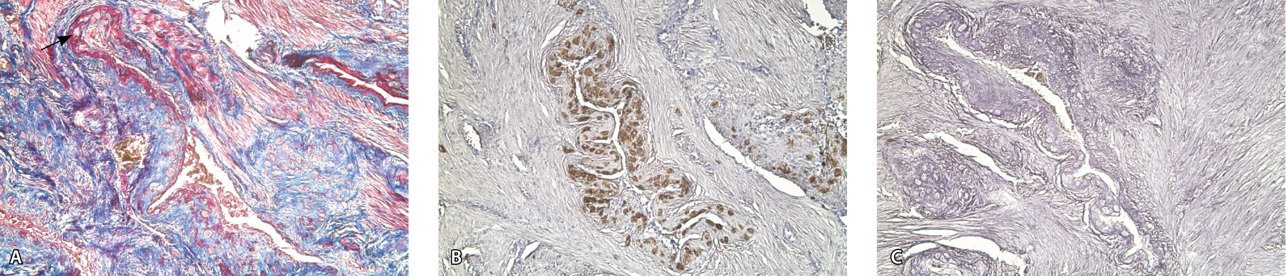 Рис. 8. Сосуды 3-го типа при гиперваскуляризации стенки матки при патологической инвазии. Внутриматочная гиперваскуляризация с дефицитом толщины миометрия, наличием рубцовой ткани, недостаточная гестационная перестройка радиальных артерий (аналог pl. increta, PAS 2 по FIGO). А – неполная гестационная перестройка радиальной артерии в составе миометрия (окраска по Маллори; × 50); в верхней части просвета артерии виден слой фибриноида, замещающего эндотелий, такой же фрагмент – в нижней части артерии (стрелка); Б – серийный срез той же радиальной артерии с визуализацией инвазирующего цитотрофобласта (маркер цитокератин 8; × 50); В – серийный срез той же радиальной артерии, при окраске на выявление эластических волокон видна полная дезорганизация эластического каркаса вместо нормальных внутренней и внешней эластических мембран, результат действия инвазирующего цитотрофобласта (окраска по Вейгерту; × 50)