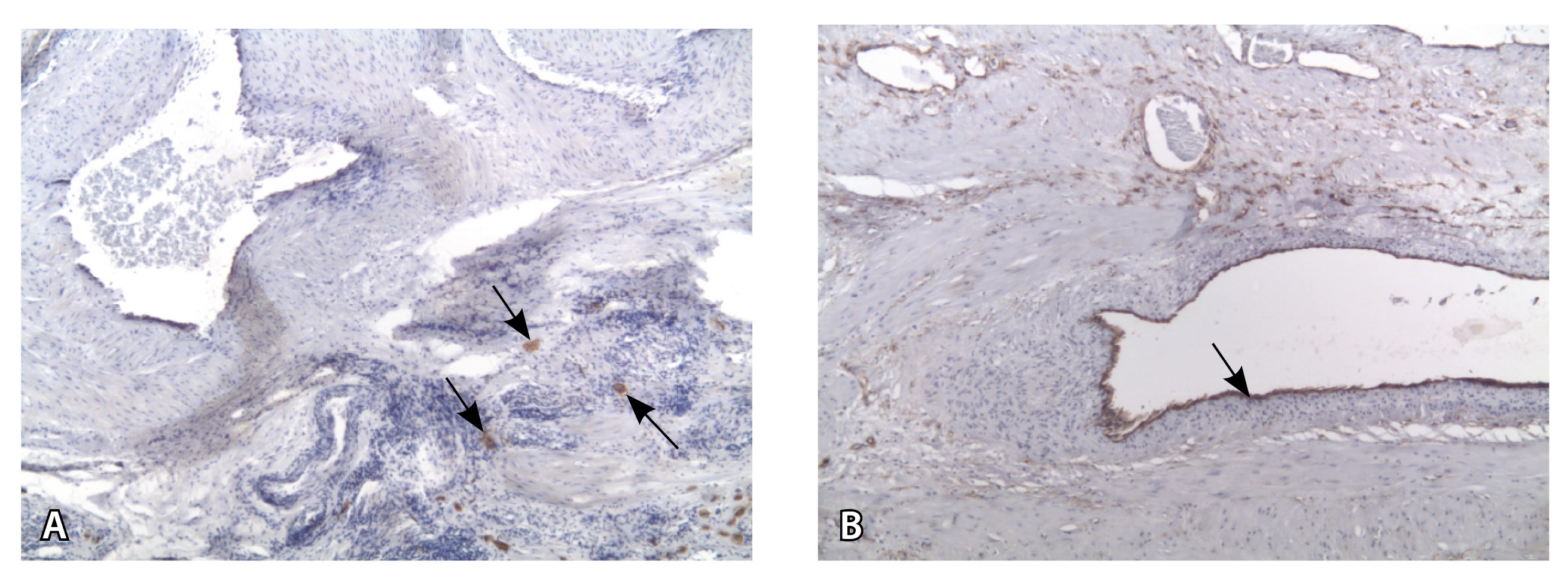Рис. 11. Сосуды 4-го типа при гиперваскуляризации стенки матки при патологической инвазии: А – крупный сосуд в составе серозной оболочки матки: справа видны единичные цитотрофобластические клетки (стрелки), не достигающие стенки артерии (иммуногистохимическое исследование, маркер цитокератин 8; × 50); Б – крупные сосуды в составе серозной оболочки: наличие внутреннего слоя эндотелиоцитов (иммуногистохимическое исследование, маркер СD34; × 50)