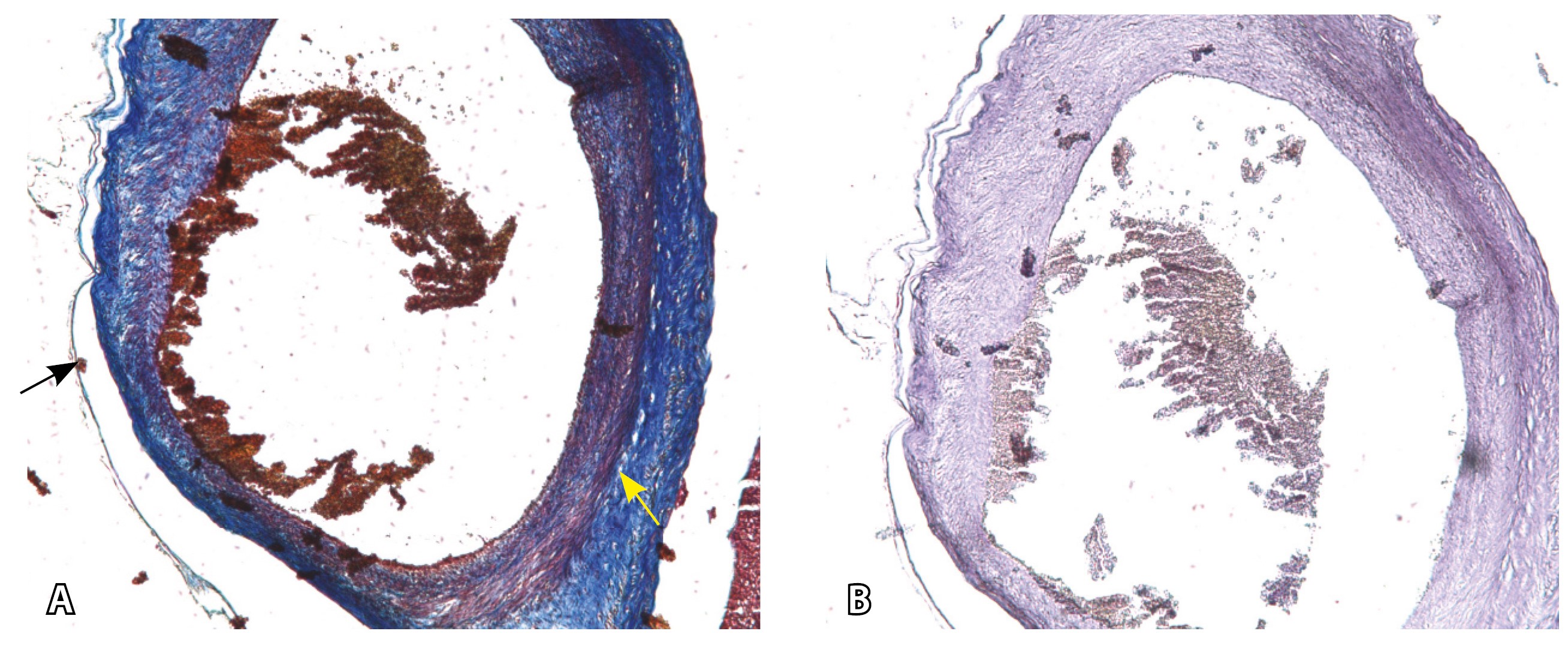 Рис. 13. Самые крупные сосуды в пределах серозной оболочки стенки матки: А, Б – серийные срезы артерии; × 50. При окраске по Маллори (А) видна тонкая полоска мезотелия (черная стрелка), слабо дифференцированная мышечная стенка артерии, вокруг нее – плотная коллагеновая оболочка (желтая стрелка), в просвете определяются тромботические массы. При окраске по Вейгерту (Б) наблюдается полная потеря внутренней и внешней эластических мембран
