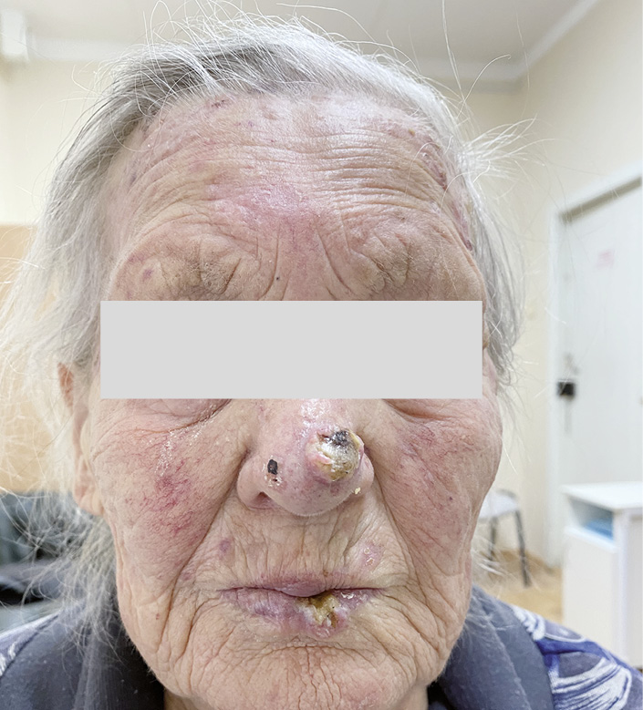 Анамнез заболевания: отмечает появление и распространение эритематозных шелушащихся пятен на лице с 50-летнего возраста, с течением времени элементы утолщались и покрывались плотными корками. Субъективно – периодический зуд и жжение. Впервые обратила внимание на появление плотных чешуек и корочек в области нижней губы около 10 лет назад, за последний год образовалась болезненная язва, покрытая толстой коркой. Согласно данным анамнеза, пациентка отмечает прогрессирующий рост опухолевидного образования на кончике носа и изъязвления в течение 1 года. Язвенный дефект периодически покрывался толстой коркой. За последние несколько месяцев установлен быстрый рост язв, болезненность и кровоточивость при травматизации и попытке удаления корок. Солнцезащитные средства в течение жизни не использовала. К врачам ранее не обращалась, самолечением не занималась.