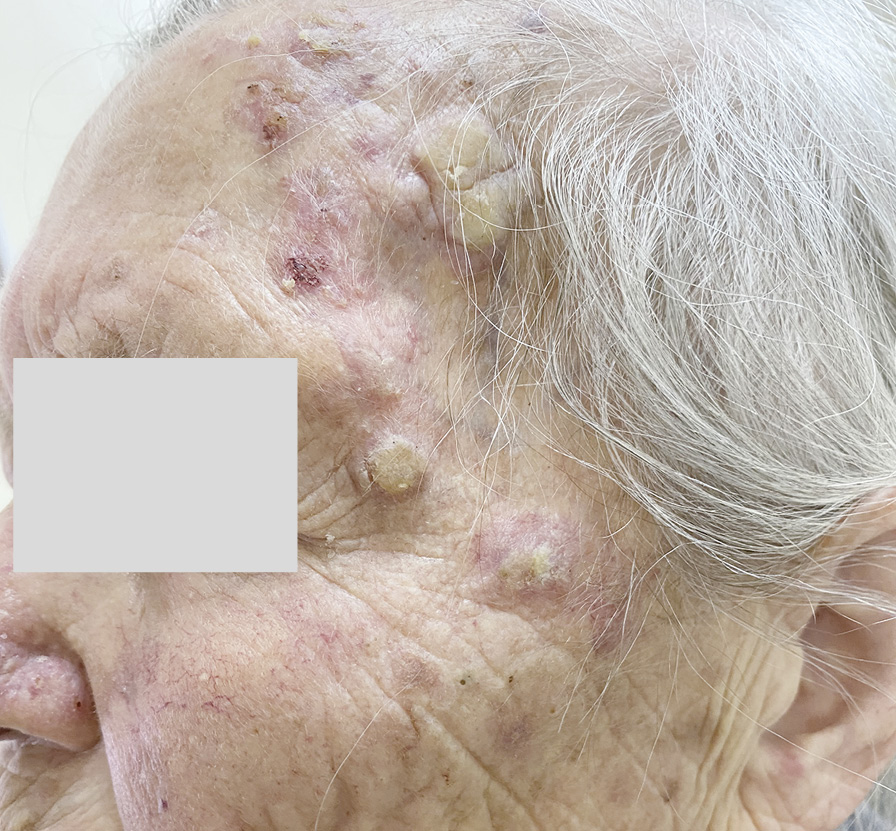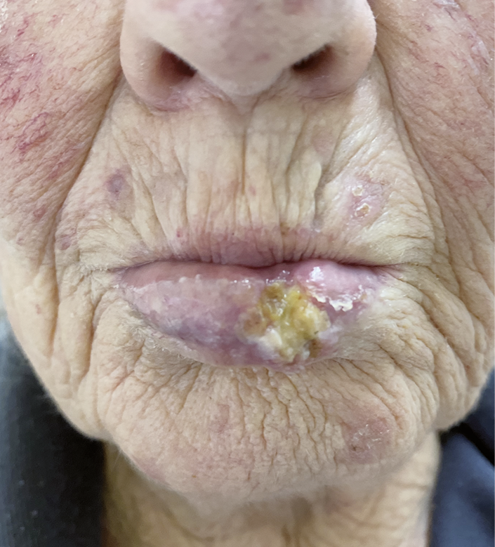 Больная С., 84 года, пенсионерка, консультирована дерматоонкологом ГБУЗ ПК «Краевой клинический кожно-венерологический диспансер». Жалобы при обращении: быстрый рост и боль опухолевидного образования на кончике носа, болезненная язва на нижней губе, образование множественных пятен с плотными корками на лице.