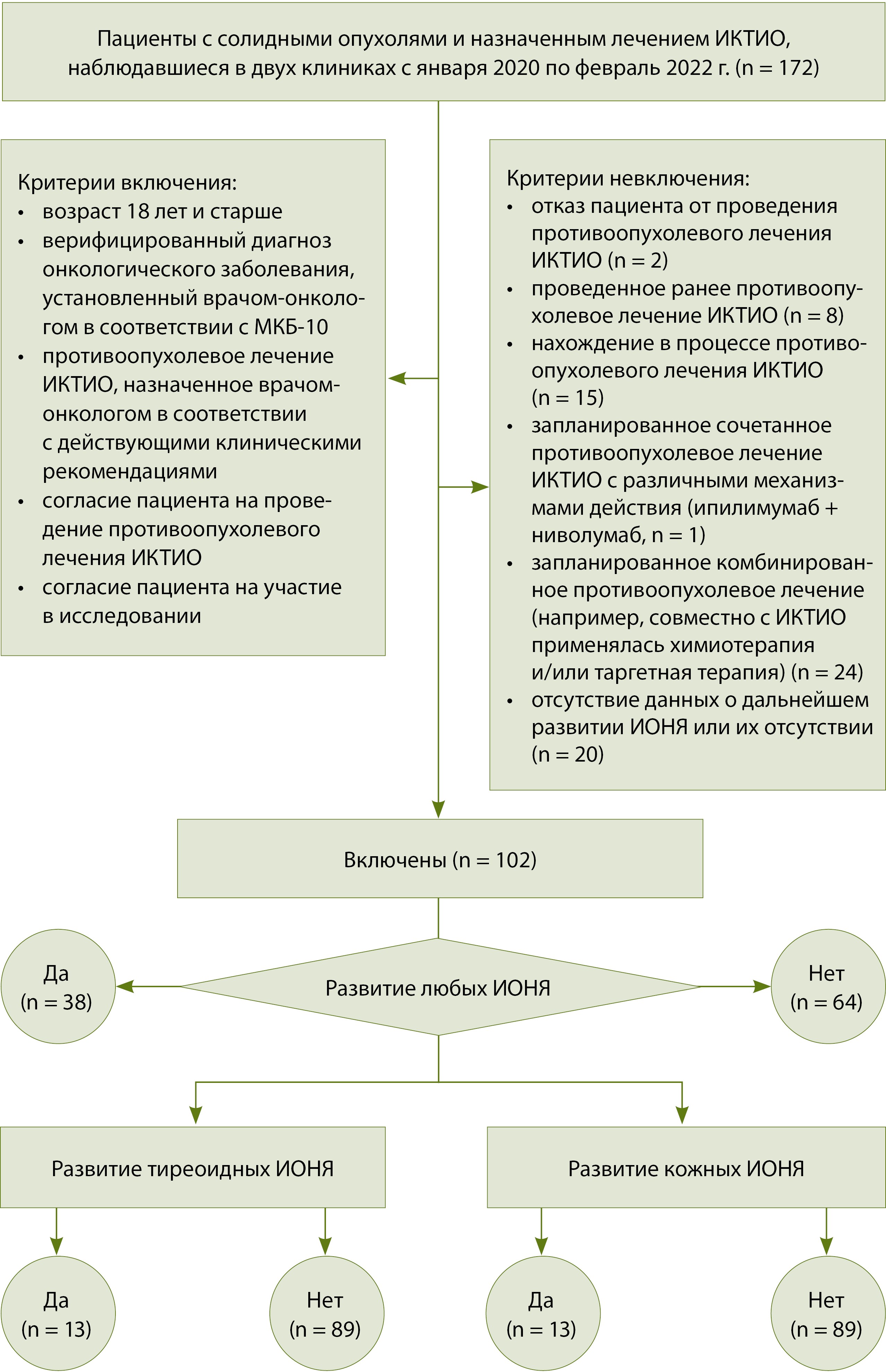 В ретроспективное сравнительное когортное исследование включали данные взрослых пациентов с верифицированным диагнозом онкологического заболевания и назначенным в соответствии с действующими клиническими рекомендациями лечением ИКТИО, проходивших обследование и лечение в период с января 2020 по февраль 2022 г. в ФГБУ «Национальный медицинский исследовательский центр онкологии им. Н.Н. Блохина» Минздрава России и ГБУЗ «Московская городская онкологическая больница № 62 Департамента здравоохранения города Москвы».