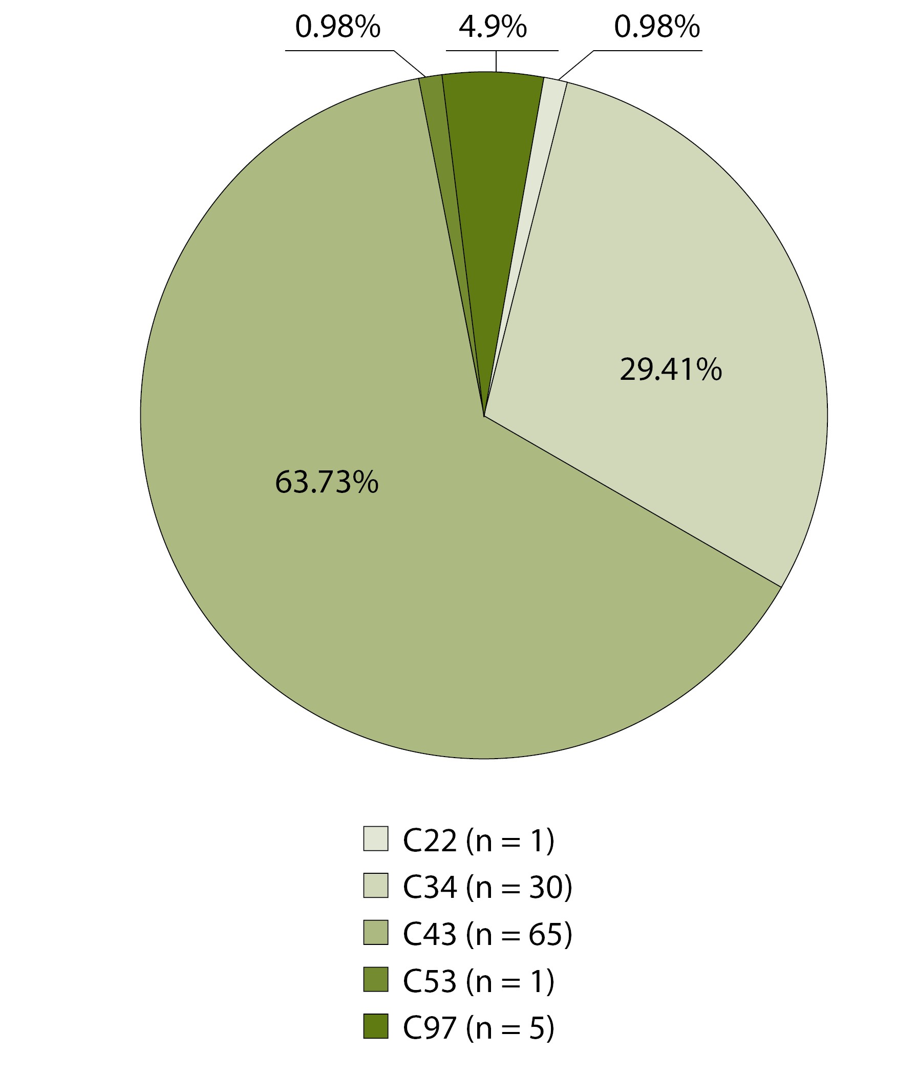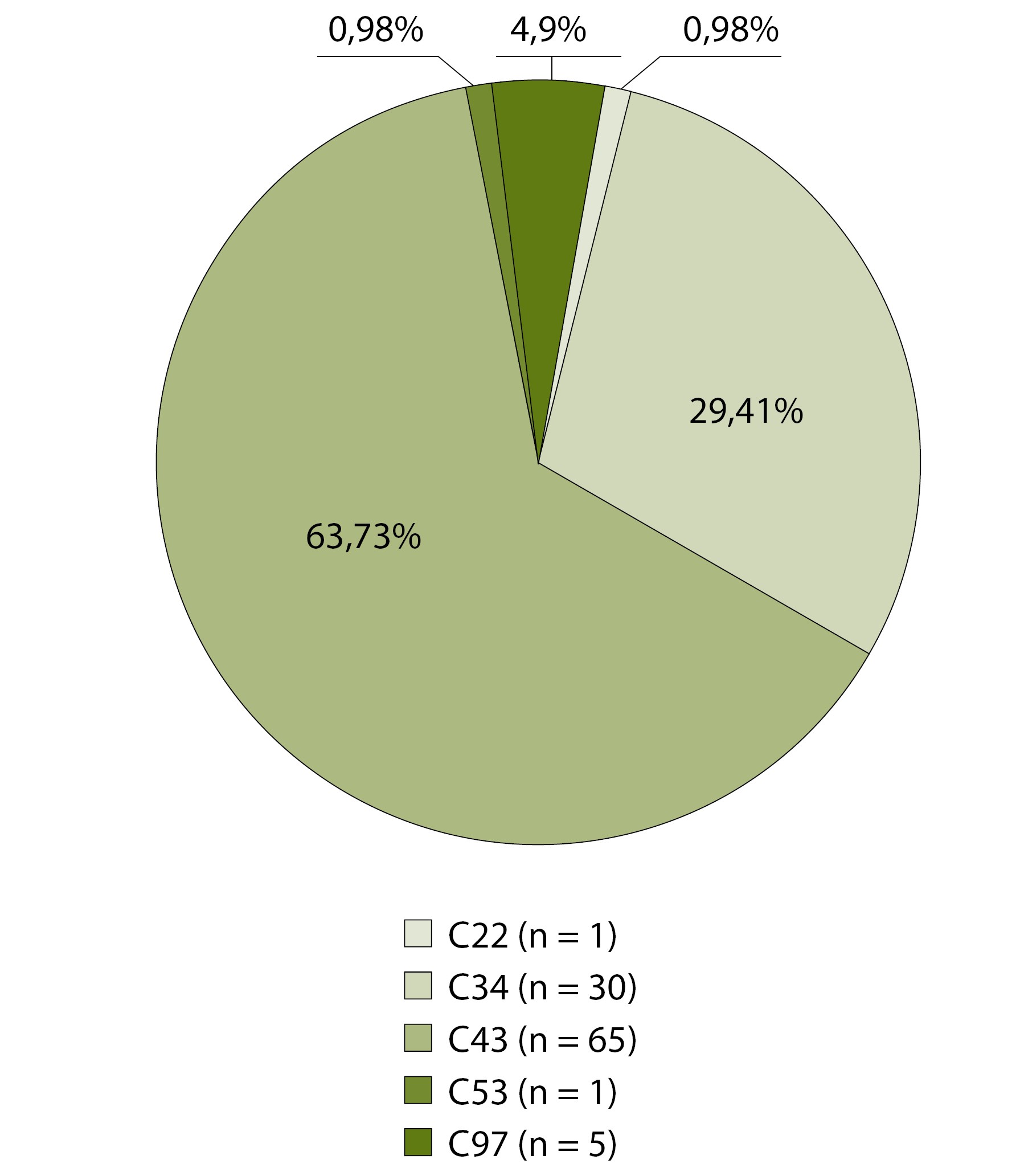 Рис. 2. Нозологическая структура онкологических заболеваний (согласно Международной классификации болезней и проблем, связанных со здоровьем, 10-го пересмотра) в исследуемой выборке (n = 102); С22 – злокачественное новообразование печени и внутрипеченочных желчных протоков; С34 – злокачественное новообразование бронхов и легкого; С43 – злокачественная меланома кожи; С53 – злокачественное новообразование шейки матки; С97 – злокачественное новообразование самостоятельных (первичных) множественных локализаций