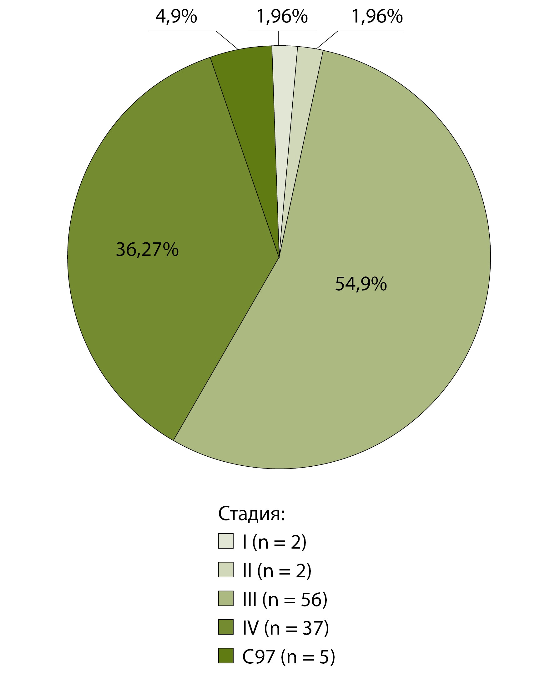 Рис. 3. Стадия онкологических заболеваний в исследуемой выборке (n = 102); С97 – злокачественное новообразование самостоятельных (первичных) множественных локализаций