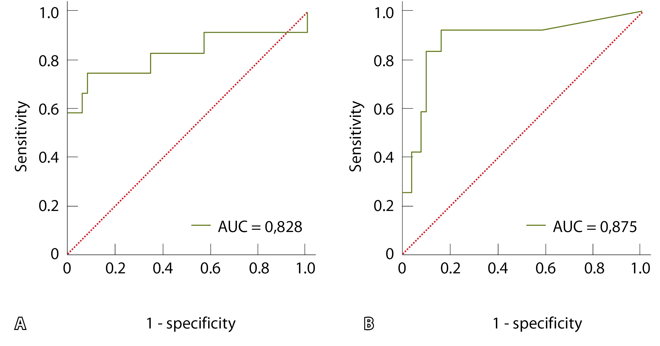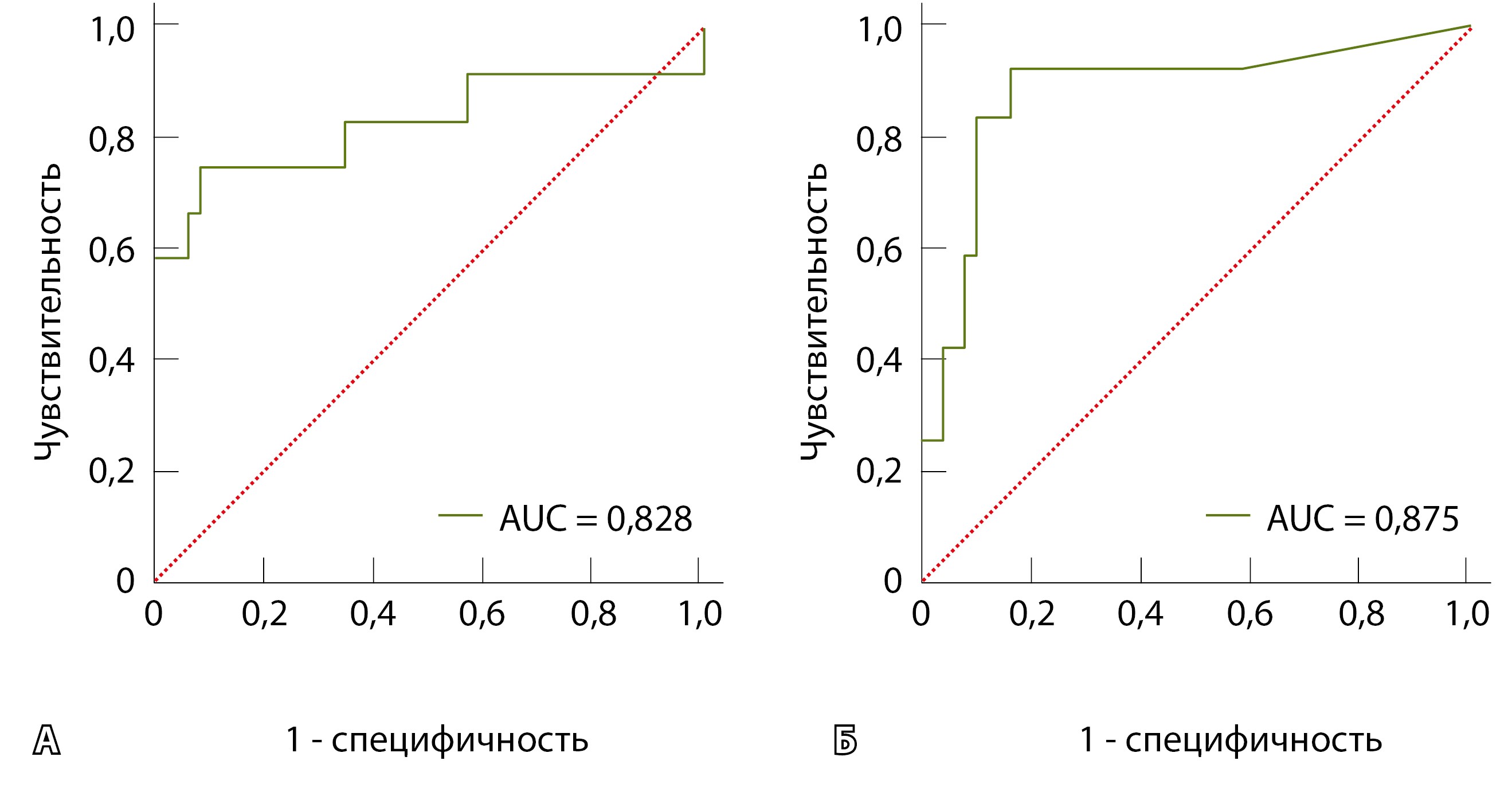 Статистический анализ выполнен с помощью программного обеспечения Statistica 13 (Tibco, США) и языка программирования Python 3.9 с использованием библиотек SciPy 1.11.1 и scikit-learn 1.3.0. Описательная статистика количественных данных представлена в виде медиан, первого и третьего квартилей в формате Me [Q1; Q3]. Для качественных показателей использованы абсолютные и относительные частоты, представленные в виде n (%). Сравнение двух независимых групп по количественным признакам проводили с помощью критерия Манна – Уитни (U-тест), трех и более независимых групп – критерия Краскела – Уоллиса. Сравнительный анализ качественных признаков выполняли с использованием точного двустороннего критерия Фишера. Для оценки диагностической способности отдельных параметров проведен ROC-анализ (англ. receiver operating characteristic – рабочая характеристика приемника). Отрезные точки определяли согласно критерию Юдена. Для каждой отрезной точки были рассчитаны следующие показатели: диагностическая чувствительность (ДЧ), диагностическая специфичность (ДС), прогностическая ценность положительного результата (ПЦПР) и прогностическая ценность отрицательного результата (ПЦОР). Критическим уровнем статистической значимости при проверке гипотез считали 0,05. При проведении множественных сравнений использовали поправку Бонферрони для коррекции критического уровня значимости (Р0). Значения уровня значимости в диапазоне от 0,05 до Р0 интерпретировали как статистическую тенденцию.