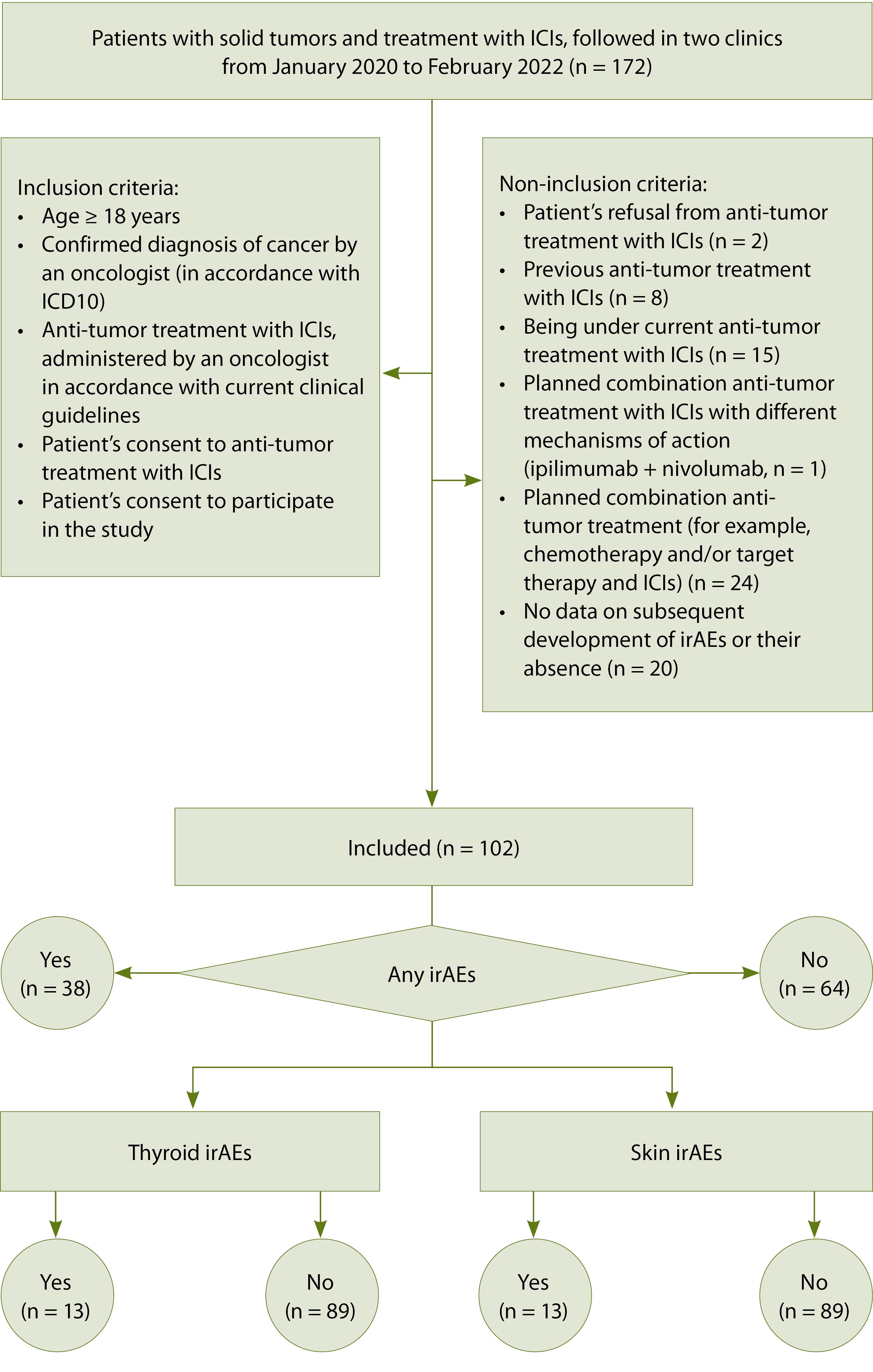 Критерии включения, невключения и исключения пациентов из исследования отражены на рис. 1. В итоговый анализ вошли данные 102 пациентов (исследуемая выборка). Пациенты были разделены на группы в зависимости от развития / отсутствия на фоне противоопухолевой иммунотерапии ИКТИО любых ИОНЯ, тиреоидных ИОНЯ, кожных ИОНЯ.