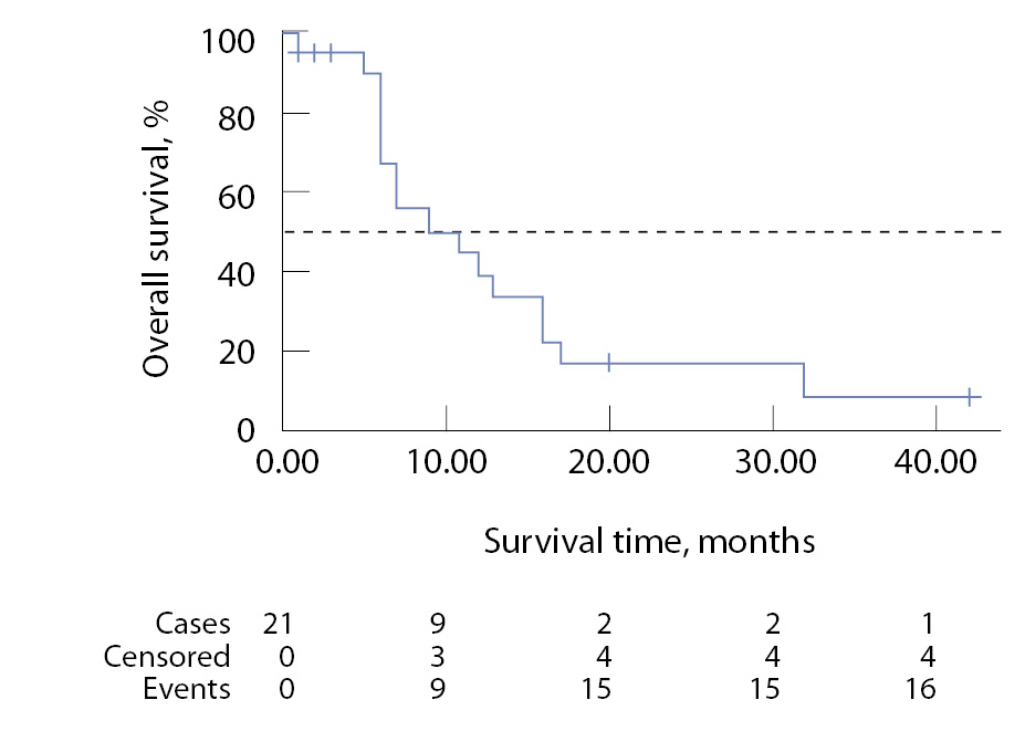 В группе ПДР с резекцией печени медиана общей выживаемости составила 11 [95% ДИ 6–16] месяцев; показатели общей 1-, 2- и 3-летней выживаемости – 39,2, 16,8 и 7,2% соответственно (рис. 1).