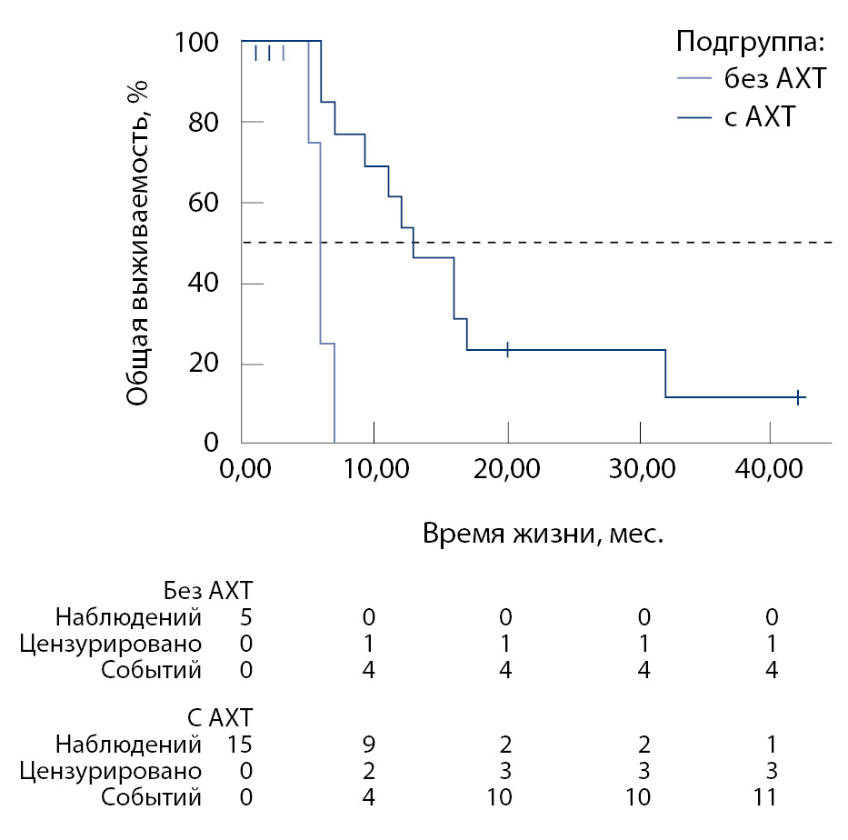 Рис. 2. Общая выживаемость в группе панкреатодуоденальной резекции с резекцией печени в зависимости от получения адъювантной химиотерапии (АХТ)