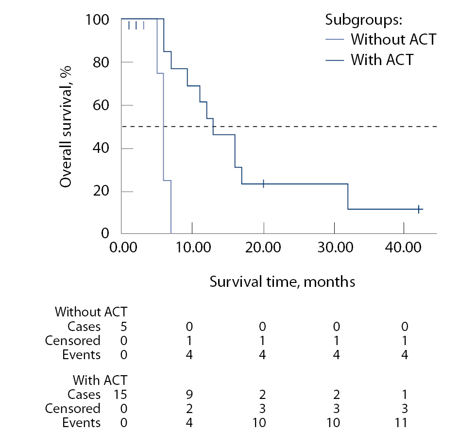 Мы проанализировали влияние адъювантной химиотерапии (АХТ) на общую выживаемость в группе ПДР с резекцией печени (рис. 2). Из 20 пациентов АХТ получили 15 (75%): 7 (46,6%) – гемцитабин, 4 (26,7%) – гемцитабин + капецитабин, 2 (13,3%) – капецитабин, 1 (6,7%) – гемцитабин + оксалиплатин, 1 (6,7%) – FOLFIRINOX. Медиана количества циклов АХТ составила 6. Комбинированная АХТ проведена всего 6 (30%) больным, перенесшим операцию (1 больной умер в послеоперационном периоде). Из 15 пациентов 3 (20%) получили 2-ю линию АХТ по поводу прогрессирования болезни, из них один в дальнейшем получил 3-ю линию противоопухолевой лекарственной терапии. Медиана общей выживаемости в подгруппе без АХТ (n = 5) составила 6 [95% ДИ 5–7] месяцев, а в подгруппе получавших АХТ (n = 15) – 13 [95% ДИ 6–16] месяцев. Различия общей выживаемости, оцененные с помощью теста отношения правдоподобия, оказались статистически значимы (p = 0,006). Общая 3-летняя выживаемость больных с АХТ составила 11,5%. При оценке рисков вероятность смерти на фоне прогрессирования заболевания в отдаленном периоде уменьшалась при проведении АХТ в 9,3 раза по сравнению с больными, не получавшими АХТ (отношение рисков (ОР) 0,107 [95% ДИ 0,023–0,509], р = 0,005).