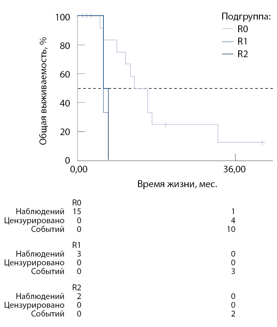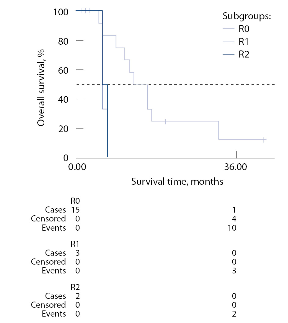 При анализе общей выживаемости в зависимости от степени радикальности операции (рис. 3) установлено, что медиана общей выживаемости в подгруппе R0 составила 13 [95% ДИ 6–32] месяцев, в подгруппе R1 – 6 [95% ДИ 6–7] месяцев, в подгруппе R2 – 6 [95% ДИ 6–7] месяцев (p = 0,021). При оценке зависимости рисков от степени радикальности операции отмечено, что вероятность летальности в отдаленном периоде увеличивалась при R1 в 9,9 раза (ОР 9,9 [95% ДИ 1,58–63,09], р = 0,014), при R2 – в 8,5 раза (ОР 8,5 [95% ДИ 1,17–62,83], р = 0,034).
