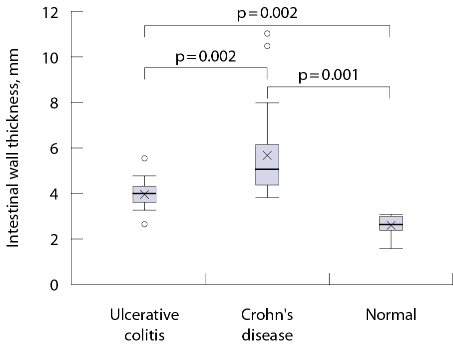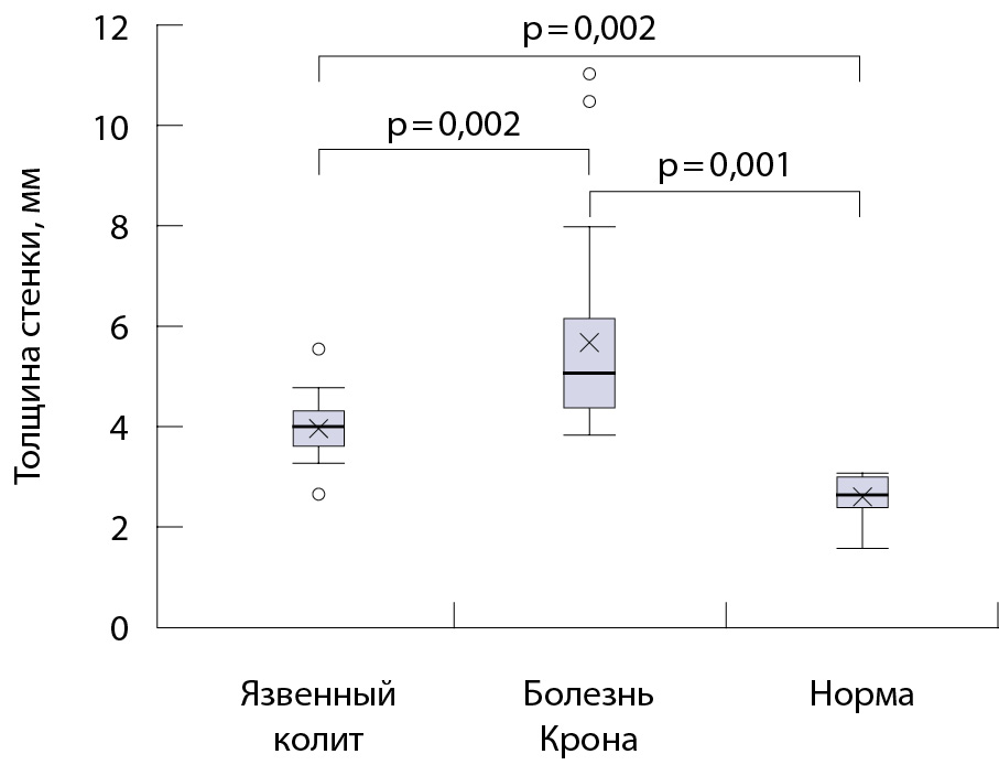 Рис. 1. Толщина стенки кишки у больных с язвенным колитом, болезнью Крона и в группе контроля; на графике представлены медианы (горизонтальная черта), интерквартильный диапазон (закрашенная область), среднее арифметическое (крест), диапазон «минимум – максимум» без учета выбросов (планки погрешности), выпадающие значения (точки). Значения р приведены для критерия Данна с поправкой Бонферрони