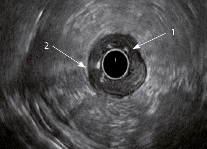 Рис. 3. Эндосонографическая картина толстой кишки при язвенном колите; 1 – утолщение слизисто-подслизистого слоя; 2 – утолщение стенки толстой кишки