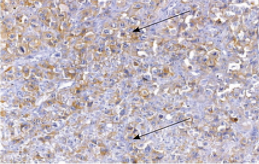 Fig. 1. PD-L1 immunohistochemistry. Positive PD-L1 expression in the nuclei and cytoplasm of the tumor cells and tumor-infiltrating lymphocytes in a polymorphous cell sarcoma sample of dedifferentiated chondrosarcoma (arrows). Micro specimen (×200)